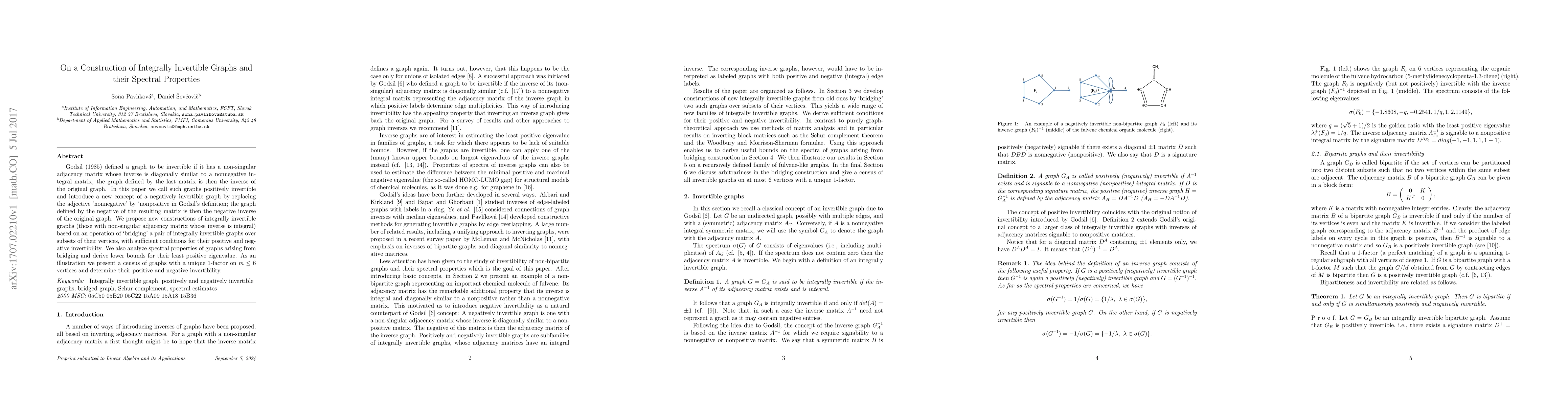Godsil (1985) defined a graph to be invertible if it has a non-singular adjacency matrix whose inverse is diagonally similar to a nonnegative integral matrix; the graph defined by the last matrix is then the inverse of the original graph. In this paper we call such graphs positively invertible and introduce a new concept of a negatively invertible graph by replacing the adjective `nonnegative' by `nonpositive in Godsil's definition; the graph defined by the negative of the resulting matrix is then the negative inverse of the original graph. We propose new constructions of integrally invertible graphs (those with non-singular adjacency matrix whose inverse is integral) based on an operation of `bridging' a pair of integrally invertible graphs over subsets of their vertices, with sufficient conditions for their positive and negative invertibility. We also analyze spectral properties of graphs arising from bridging and derive lower bounds for their least positive eigenvalue. As an illustration we present a census of graphs with a unique 1-factor on $m\le 6$ vertices and determine their positive and negative invertibility.
