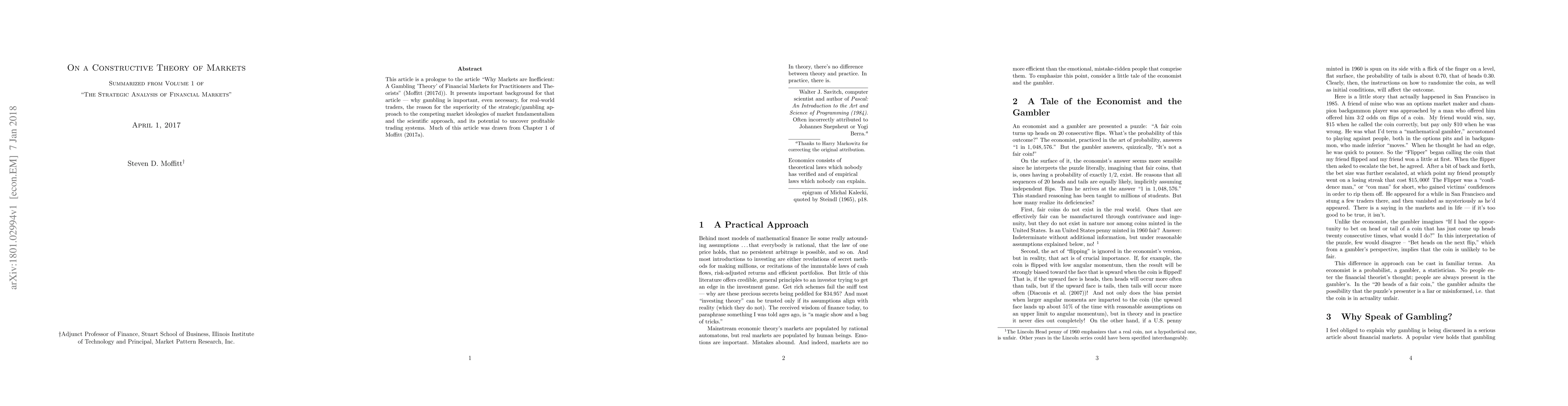 This article is a prologue to the article "Why Markets are Inefficient: A Gambling 'Theory' of Financial Markets for Practitioners and Theorists." It presents important background for that article --- why gambling is important, even necessary, for real-world traders --- the reason for the superiority of the strategic/gambling approach to the competing market ideologies of market fundamentalism and the scientific approach --- and its potential to uncover profitable trading systems. Much of this article was drawn from Chapter 1 of the book "The Strategic Analysis of Financial Markets (in 2 volumes)" World Scientific, 2017.
