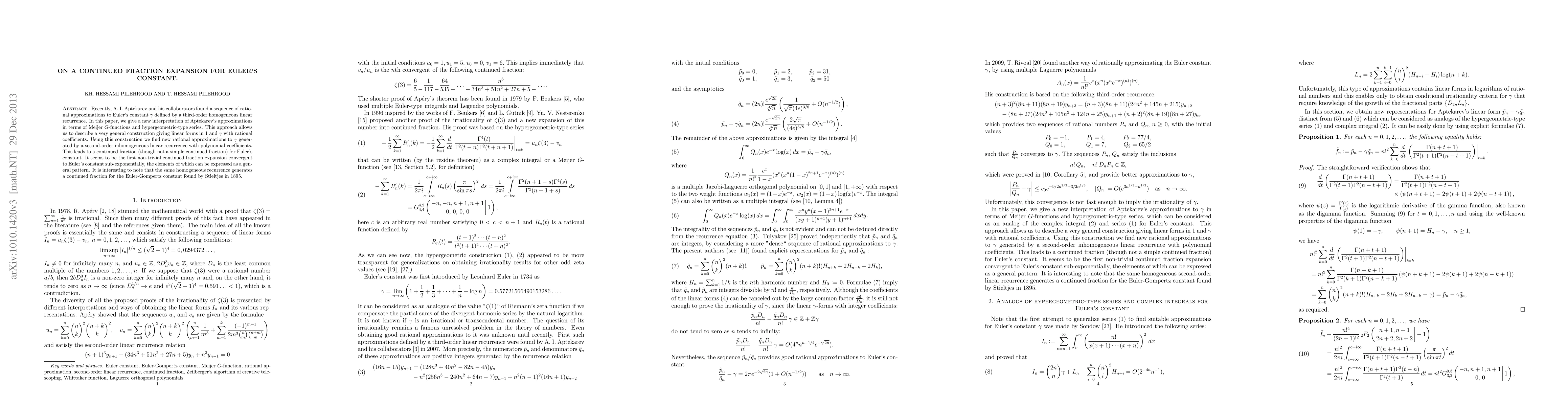 Recently, A. I. Aptekarev and his collaborators found a sequence of rational approximations to Euler's constant $\gamma$ defined by a third-order homogeneous linear recurrence. In this paper, we give a new interpretation of Aptekarev's approximations in terms of Meijer $G$-functions and hypergeometric-type series. This approach allows us to describe a very general construction giving linear forms in 1 and $\gamma$ with rational coefficients. Using this construction we find new rational approximations to $\gamma$ generated by a second-order inhomogeneous linear recurrence with polynomial coefficients. This leads to a continued fraction (though not a simple continued fraction) for Euler's constant. It seems to be the first non-trivial continued fraction expansion convergent to Euler's constant sub-exponentially, the elements of which can be expressed as a general pattern. It is interesting to note that the same homogeneous recurrence generates a continued fraction for the Euler-Gompertz constant found by Stieltjes in 1895.