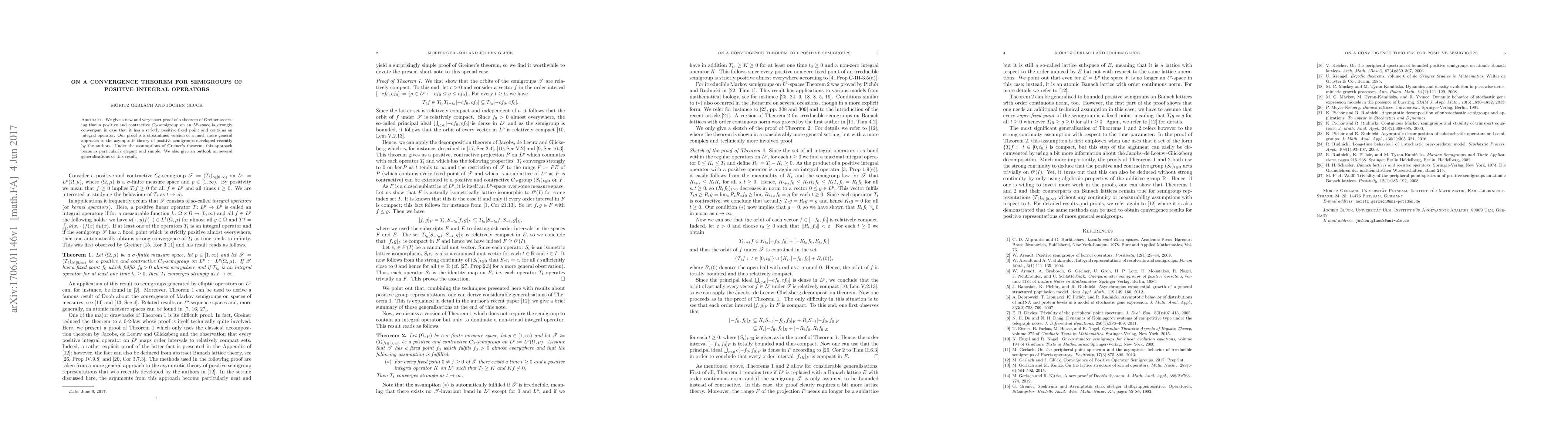 We give a new and very short proof of a theorem of Greiner asserting that a positive and contractive $C_0$-semigroup on an $L^p$-space is strongly convergent in case that it has a strictly positive fixed point and contains an integral operator. Our proof is a streamlined version of a much more general approach to the asymptotic theory of positive semigroups developed recently by the authors. Under the assumptions of Greiner's theorem, this approach becomes particularly elegant and simple. We also give an outlook on several generalisations of this result.