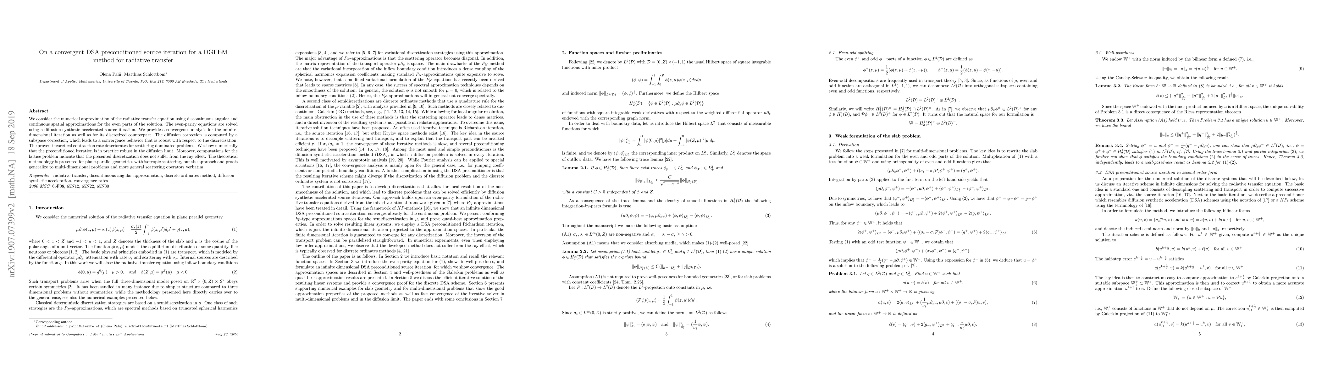 We consider the numerical approximation of the radiative transfer equation using discontinuous angular and continuous spatial approximations for the even parts of the solution. The even-parity equations are solved using a diffusion synthetic accelerated source iteration. We provide a convergence analysis for the infinite-dimensional iteration as well as for its discretized counterpart. The diffusion correction is computed by a subspace correction, which leads to a convergence behavior that is robust with respect to the discretization. The proven theoretical contraction rate deteriorates for scattering dominated problems. We show numerically that the preconditioned iteration is in practice robust in the diffusion limit. Moreover, computations for the lattice problem indicate that the presented discretization does not suffer from the ray effect. The theoretical methodology is presented for plane-parallel geometries with isotropic scattering, but the approach and proofs generalize to multi-dimensional problems and more general scattering operators verbatim.