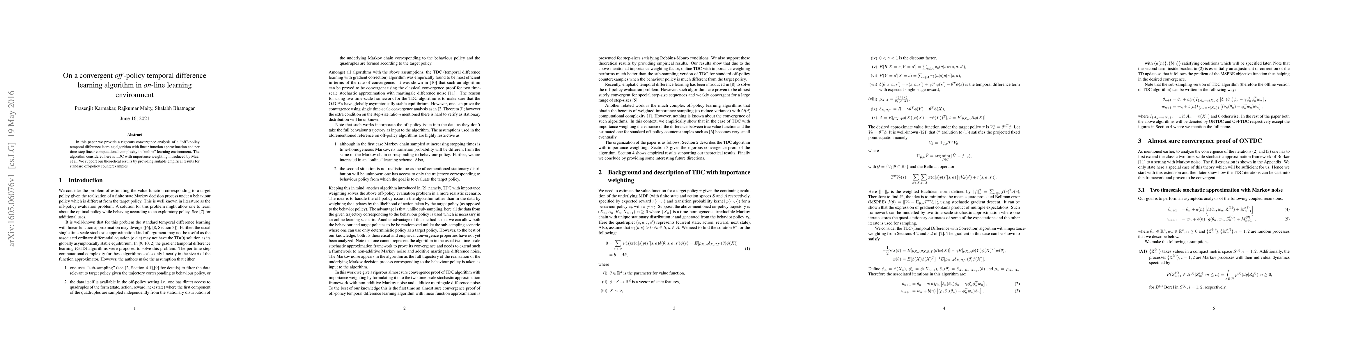 This paper rigorously analyzes the convergence of an off-policy temporal difference learning algorithm with linear function approximation and linear computational complexity in online learning environments. The algorithm, TDC with importance weighting, is supported by empirical results on standard off-policy examples.