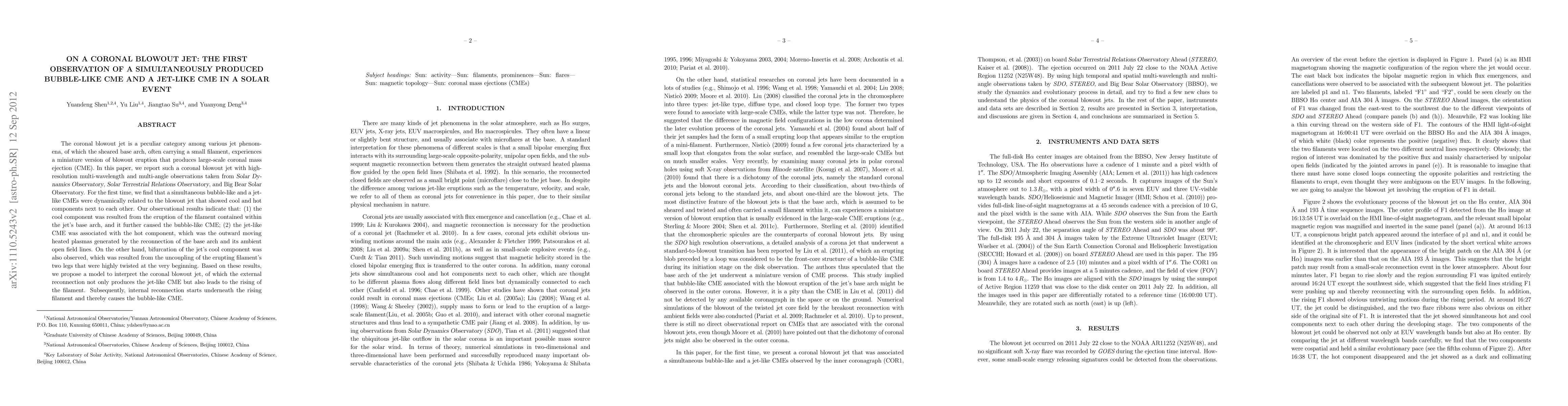 This paper reports the first observation of a coronal blowout jet accompanied by both a bubble-like and a jet-like coronal mass ejection (CME). The study reveals that the cool component, resulting from the filament eruption, generates the bubble-like CME, while the hot component, due to external reconnection, produces the jet-like CME. The authors propose a model explaining the simultaneous production of these two types of CMEs.