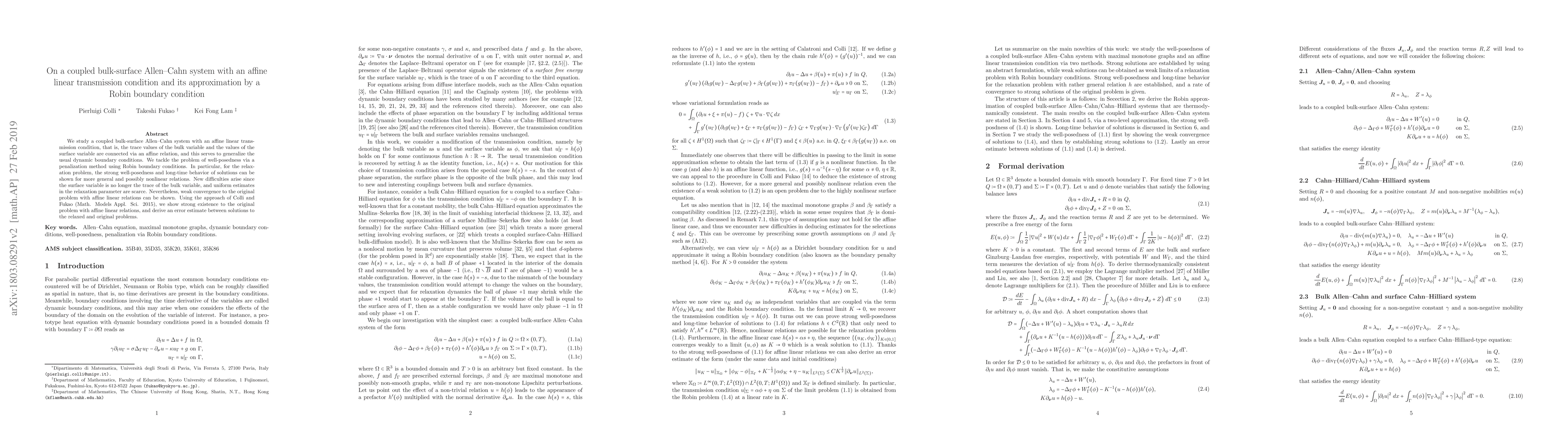 Researchers study a new model for coupled bulk-surface systems with affine linear transmission conditions, showing strong existence and long-time behavior of solutions, as well as an error estimate between relaxed and original problems.