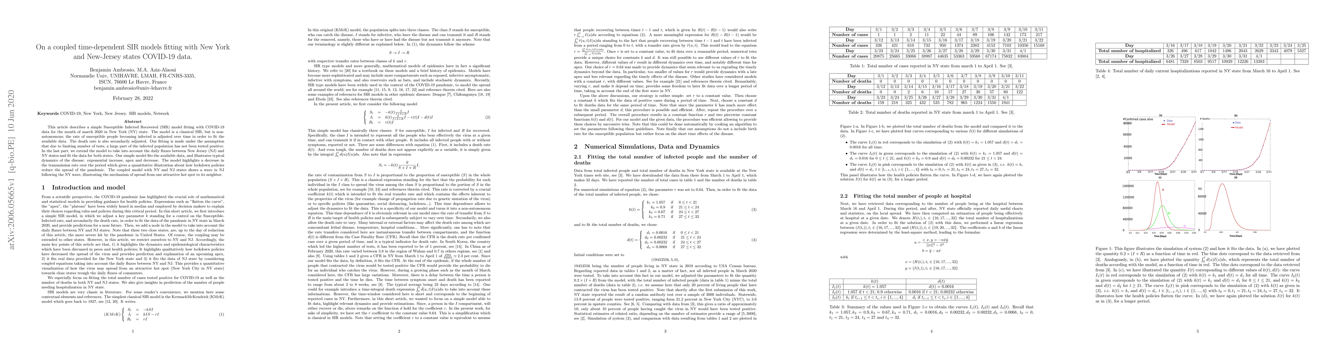 This article describes a simple Susceptible Infected Recovered (SIR) model fitting with COVID-19 data for the month of march 2020 in New York (NY) state. The model is a classical SIR, but is non-autonomous; the rate of susceptible people becoming infected is adjusted over time in order to fit the available data. The death rate is also secondarily adjusted. Our fitting is made under the assumption that due to limiting number of tests, a large part of the infected population has not been tested positive. In the last part, we extend the model to take into account the daily fluxes between New Jersey (NJ) and NY states and fit the data for both states. Our simple model fits the available data, and illustrates typical dynamics of the disease: exponential increase, apex and decrease. The model highlights a decrease in the transmission rate over the period which gives a quantitative illustration about how lockdown policies reduce the spread of the pandemic. The coupled model with NY and NJ states shows a wave in NJ following the NY wave, illustrating the mechanism of spread from one attractive hot spot to its neighbor. }