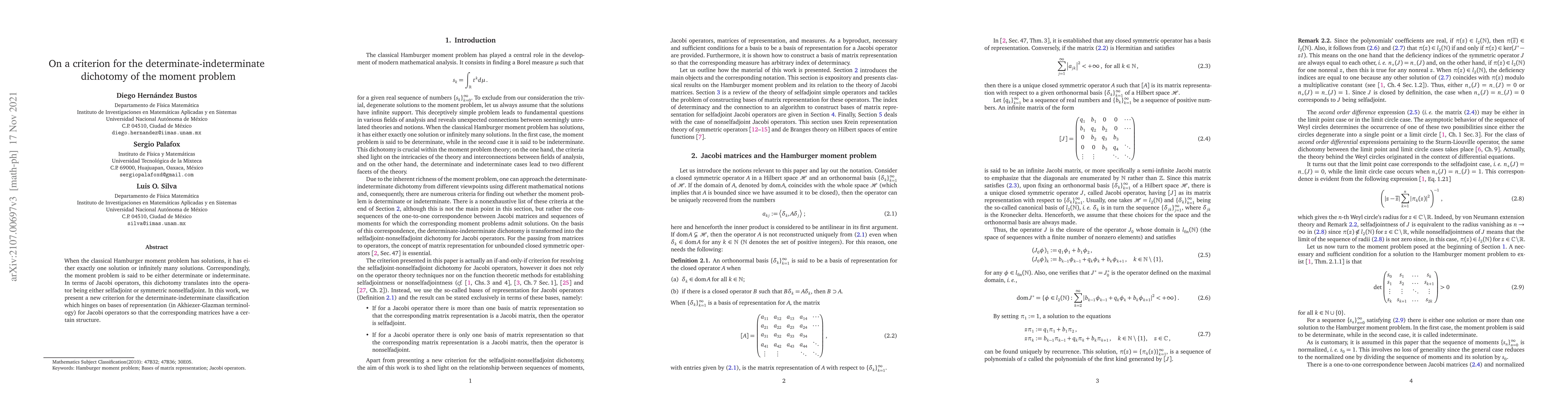 When the classical Hamburger moment problem has solutions, it has either exactly one solution or infinitely many solutions. Correspondingly, the moment problem is said to be either determinate or indeterminate. In terms of Jacobi operators, this dichotomy translates into the operator being either selfadjoint or symmetric nonselfadjoint. In this work, we present a new criterion for the determinate-indeterminate classification which hinges on bases of representation (in Akhiezer-Glazman terminology) for Jacobi operators so that the corresponding matrices have a certain structure.