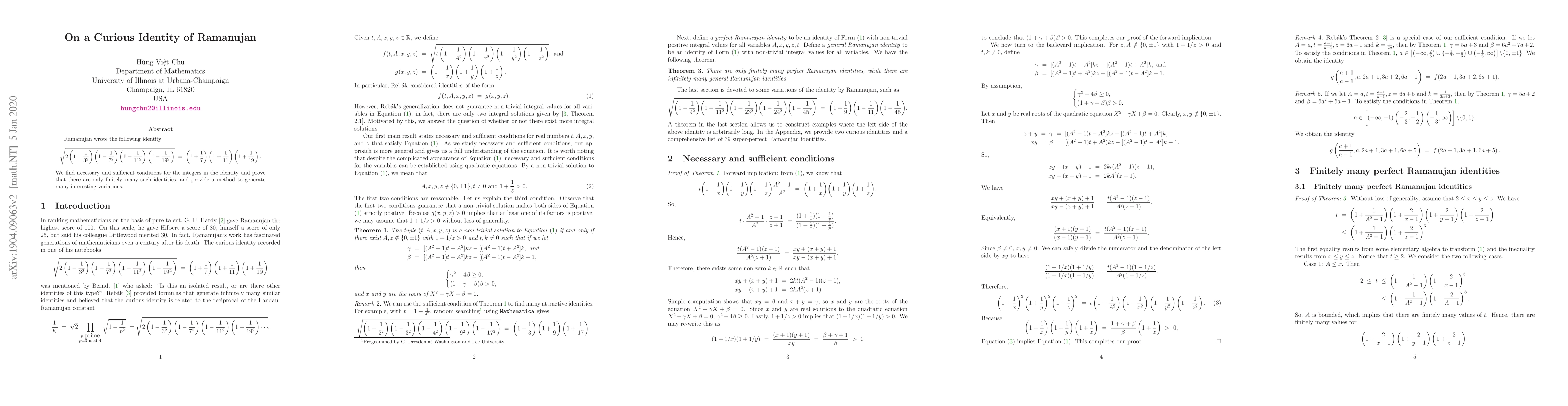 Ramanujan wrote the following identity \begin{align*} \sqrt{2 \left(1 - \frac{1}{3^2}\right) \left(1 - \frac{1}{7^2}\right) \left(1 - \frac{1}{11^2}\right) \left(1 - \frac{1}{19^2}\right)} \ = \ \left(1 + \frac{1}{7}\right) \left(1 + \frac{1}{11}\right) \left(1 + \frac{1}{19}\right). \end{align*} We find necessary and sufficient conditions for the integers in the identity and prove that there are only finitely many such identities, and provide a method to generate many interesting variations.