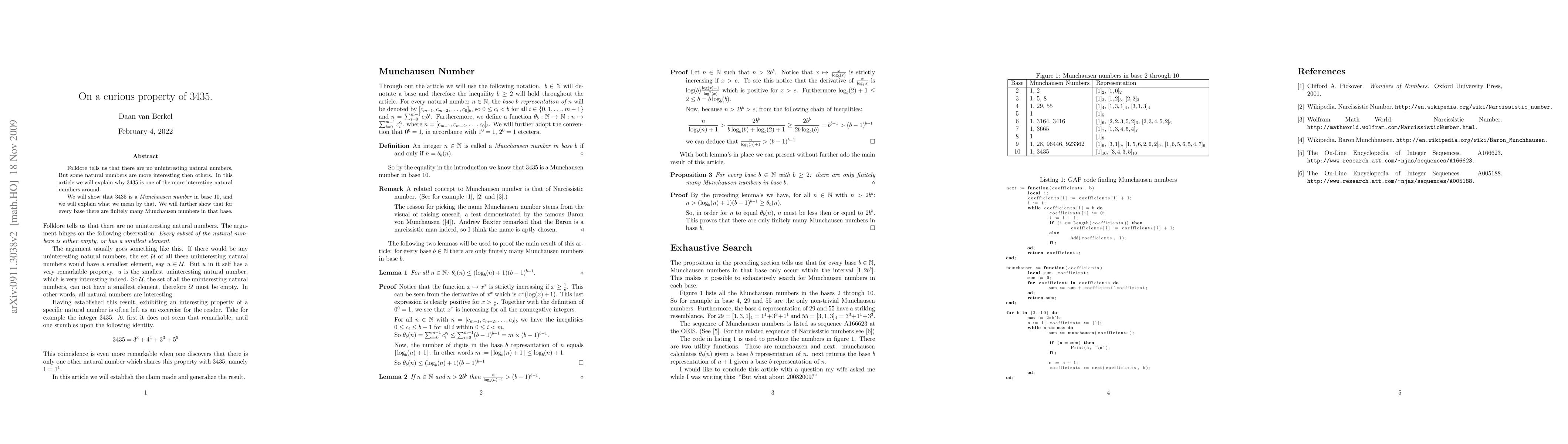Folklore tells us that there are no uninteresting natural numbers. But some natural numbers are more interesting then others. In this article we will explain why 3435 is one of the more interesting natural numbers around. We will show that 3435 is a Munchausen number in base 10, and we will explain what we mean by that. We will further show that for every base there are finitely many Munchausen numbers in that base.