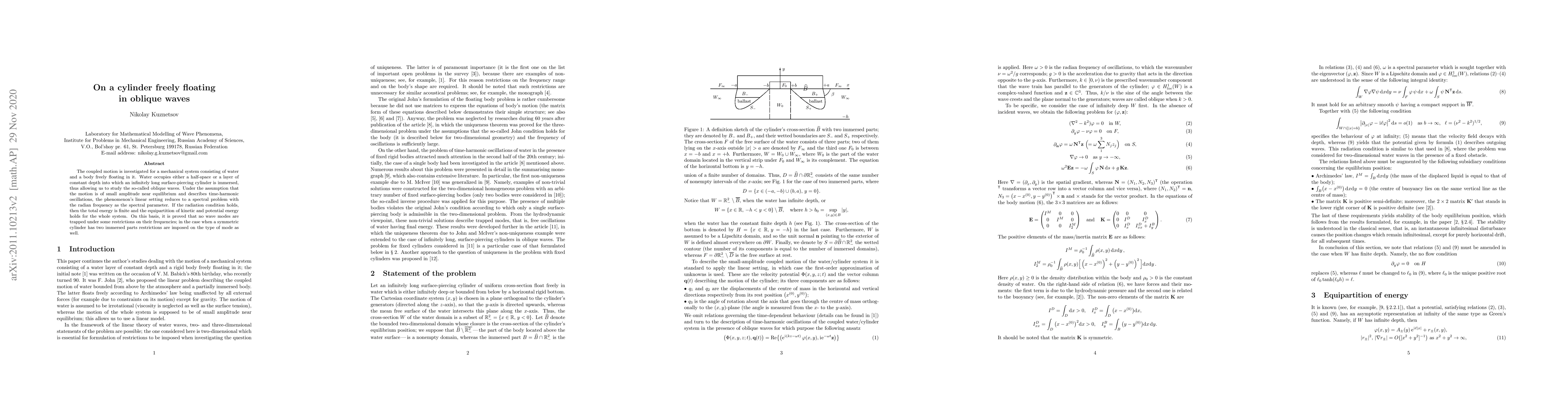 The coupled motion is investigated for a mechanical system consisting of water and a body freely floating in it. Water occupies either a half-space or a layer of constant depth into which an infinitely long surface-piercing cylinder is immersed, thus allowing us to study the so-called oblique waves. Under the assumption that the motion is of small amplitude near equilibrium and describes time-harmonic oscillations, the phenomenon's linear setting reduces to a spectral problem with the radian frequency as the spectral parameter. If the radiation condition holds, then the total energy is finite and the equipartition of kinetic and potential energy holds for the whole system. On this basis, it is proved that no wave modes are trapped under some restrictions on their frequencies; in the case when a symmetric cylinder has two immersed parts restrictions are imposed on the type of mode as well.