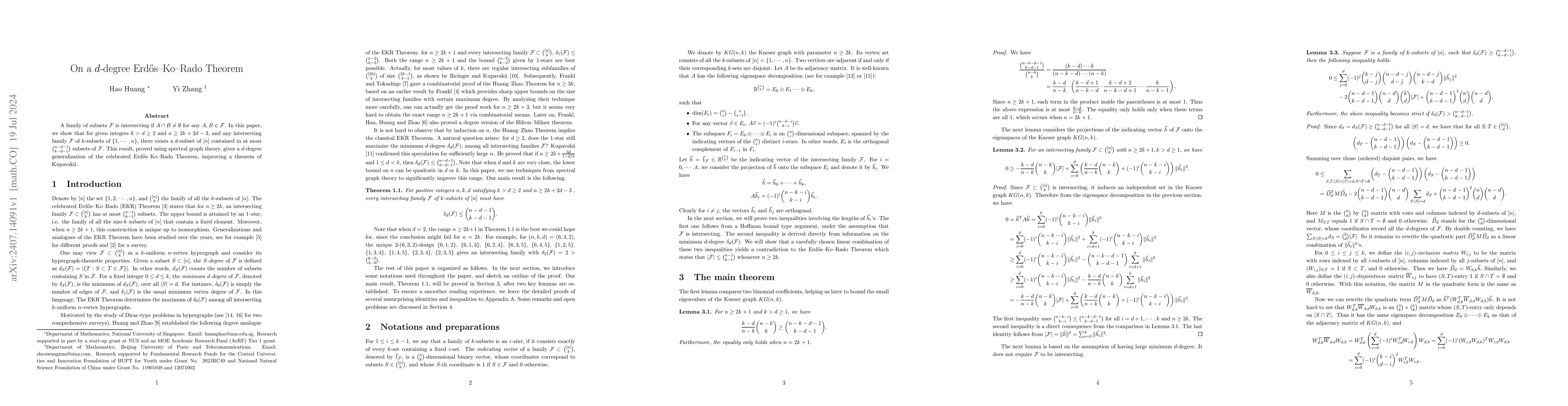 This paper generalizes the Erdős-Ko-Rado Theorem to $d$-degree, showing that for intersecting families of $k$-subsets within $n$, there exists a $d$-subset contained in no more than $\binom{n-d-1}{k-d-1}$ subsets, using spectral graph theory for proof.