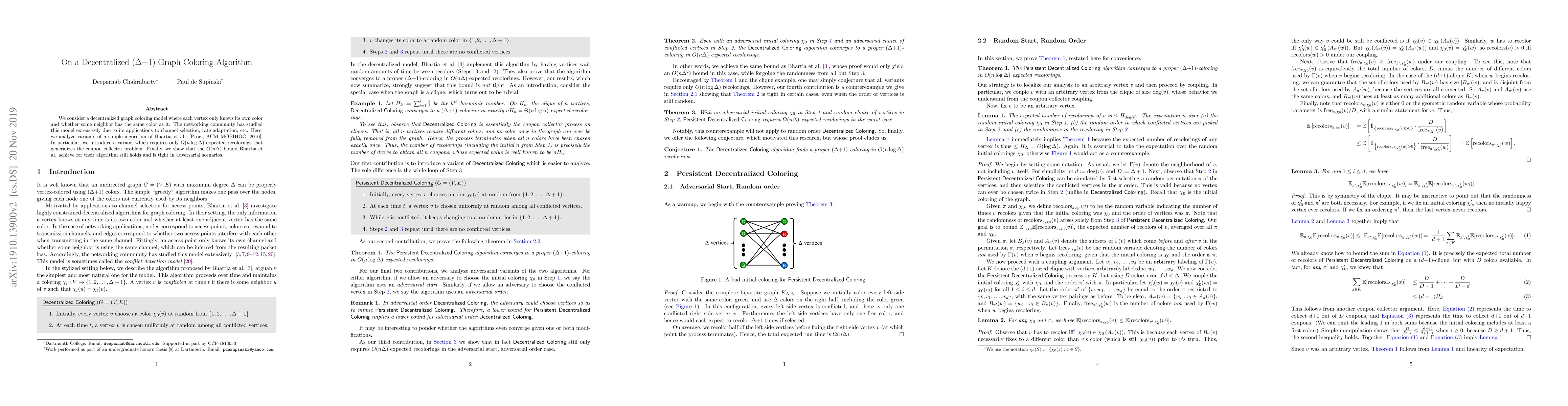 We consider a decentralized graph coloring model where each vertex only knows its own color and whether some neighbor has the same color as it. The networking community has studied this model extensively due to its applications to channel selection, rate adaptation, etc. Here, we analyze variants of a simple algorithm of Bhartia et al. [Proc., ACM MOBIHOC, 2016]. In particular, we introduce a variant which requires only $O(n\log\Delta)$ expected recolorings that generalizes the coupon collector problem. Finally, we show that the $O(n\Delta)$ bound Bhartia et al. achieve for their algorithm still holds and is tight in adversarial scenarios.