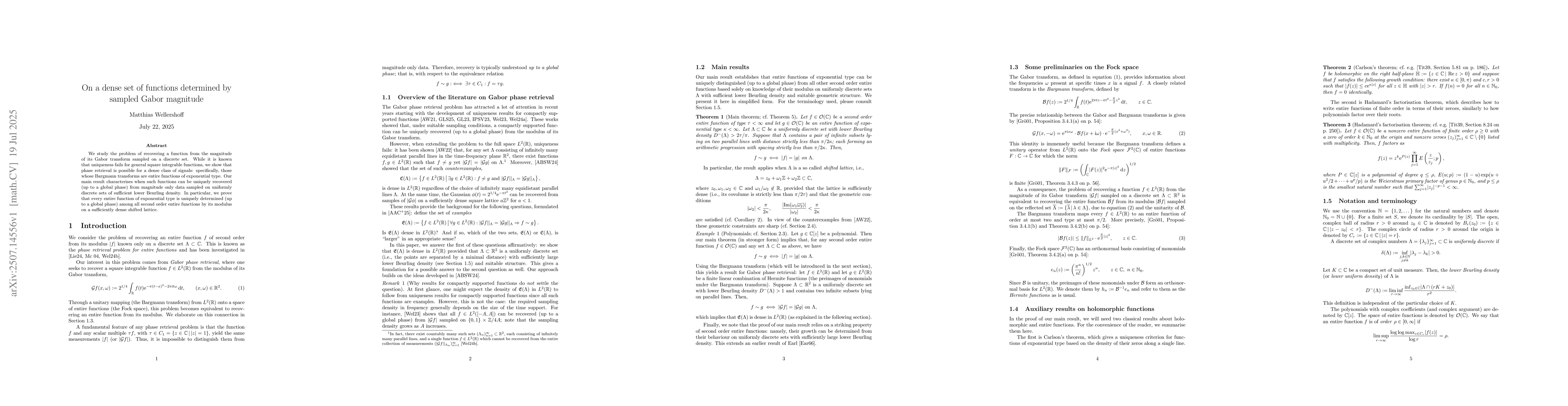 We study the problem of recovering a function from the magnitude of its Gabor transform sampled on a discrete set. While it is known that uniqueness fails for general square integrable functions, we show that phase retrieval is possible for a dense class of signals: specifically, those whose Bargmann transforms are entire functions of exponential type. Our main result characterises when such functions can be uniquely recovered (up to a global phase) from magnitude only data sampled on uniformly discrete sets of sufficient lower Beurling density. In particular, we prove that every entire function of exponential type is uniquely determined (up to a global phase) among all second order entire functions by its modulus on a sufficiently dense shifted lattice.