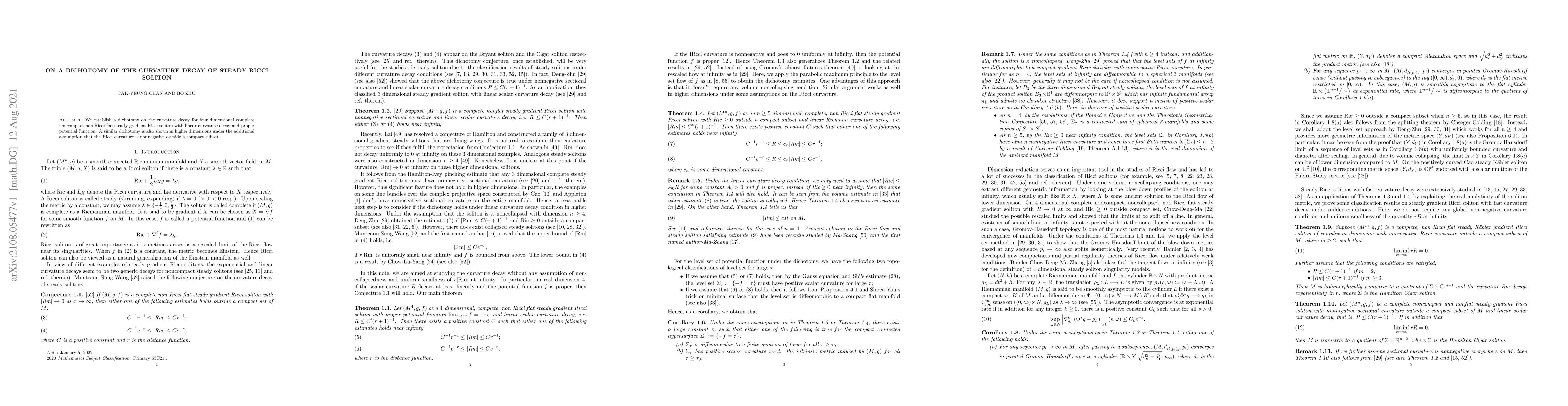 The paper presents a dichotomy for the curvature decay in four-dimensional complete, noncompact, non Ricci-flat steady gradient Ricci solitons with linear curvature decay and proper potential functions. This result extends to higher dimensions under the condition of nonnegative Ricci curvature outside a compact subset.
