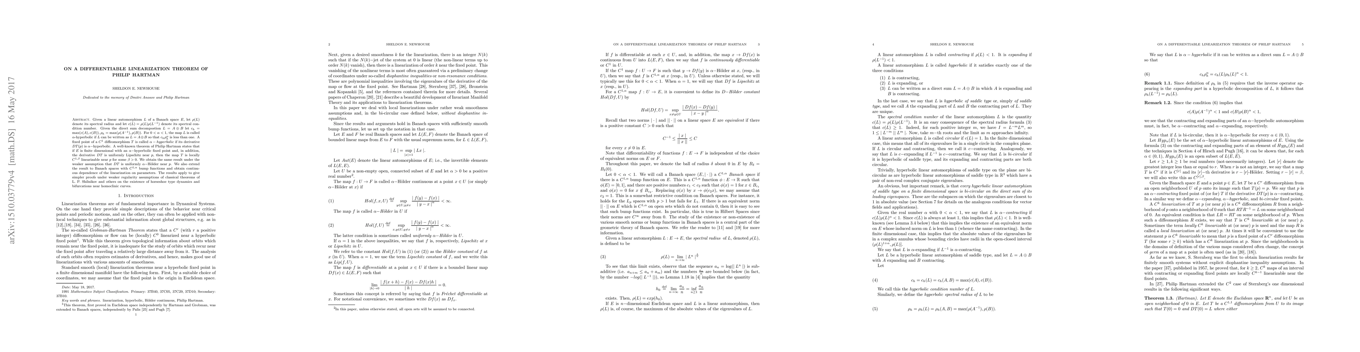 A linear automorphism of Euclidean space is called bi-circular its eigenvalues lie in the disjoint union of two circles $C_1$ and $C_2$ in the complex plane where the radius of $C_1$ is $r_1$, the radius of $C_2$ is $r_2$, and $0 < r_1 < 1 < r_2$. A well-known theorem of Philip Hartman states that a local $C^{1,1}$ diffeomorphism $T$ of Euclidean space with a fixed point $p$ whose derivative $DT_p$ is bi-circular is $C^{1,\beta}$ linearizable near $p$. We generalize this result to $C^{1,\alpha}$ diffeomorphisms $T$ where $0 < \alpha < 1$. We also extend the result to local diffeomorphisms in Banach spaces with $C^{1,\alpha}$ bump functions. The results apply to give simpler proofs under weaker regularity conditions of classical results of L. P. Shilnikov on the existence of horseshoe dynamics near so-called saddle-focus critical points of vector fields in $R^3$.