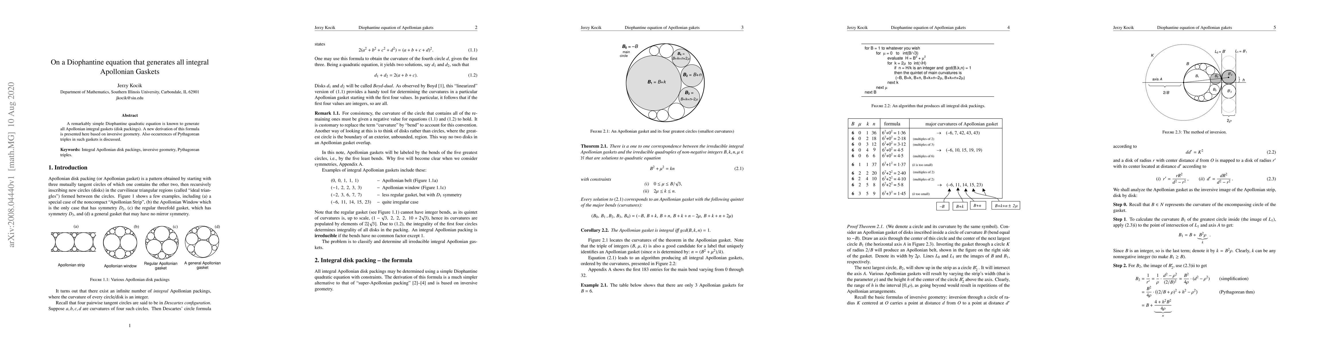 A remarkably simple Diophantine quadratic equation is known to generate all Apollonian integral gaskets (disk packings). A new derivation of this formula is presented here based on inversive geometry. Also occurrences of Pythagorean triples in such gaskets is discussed.