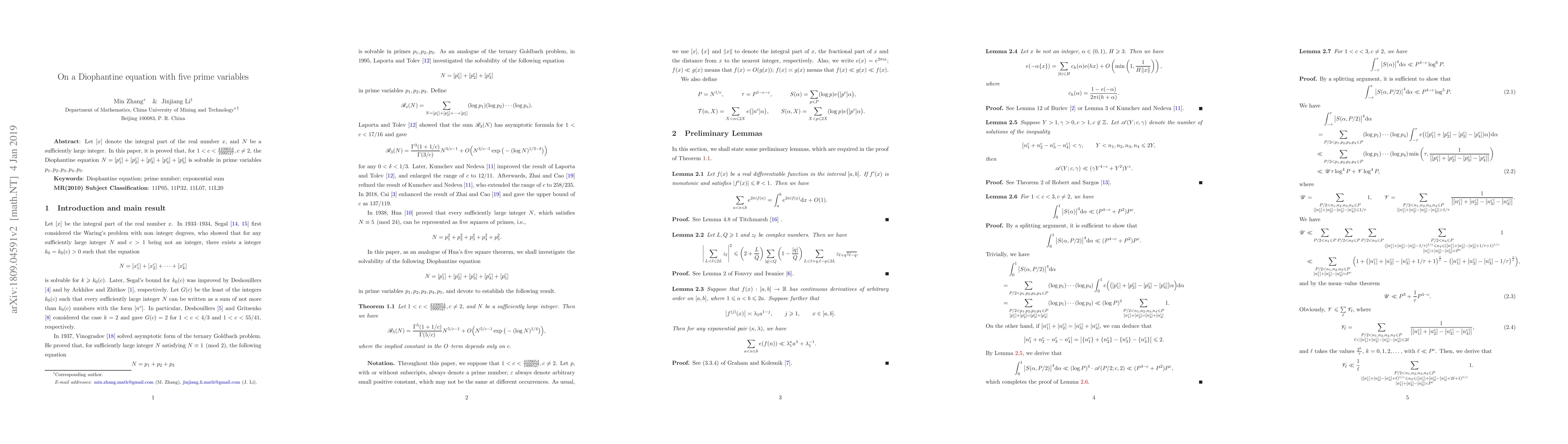 This paper proves the solvability of the Diophantine equation $N=[p_1^c]+[p_2^c]+[p_3^c]+[p_4^c]+[p_5^c]$ in prime variables for $1<c<\frac{4109054}{1999527}$, excluding $c=2$, for sufficiently large integer $N$.