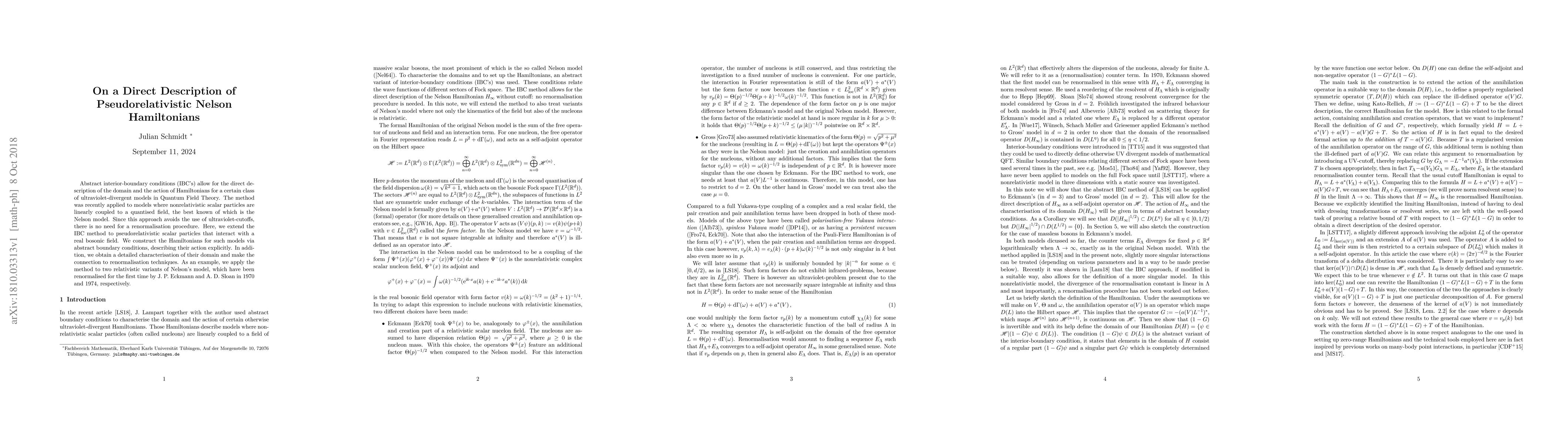 Abstract interior-boundary conditions (IBC's) allow for the direct description of the domain and the action of Hamiltonians for a certain class of ultraviolet-divergent models in Quantum Field Theory. The method was recently applied to models where nonrelativistic scalar particles are linearly coupled to a quantised field, the best known of which is the Nelson model. Since this approach avoids the use of ultraviolet-cutoffs, there is no need for a renormalisation procedure. Here, we extend the IBC method to pseudorelativistic scalar particles that interact with a real bosonic field. We construct the Hamiltonians for such models via abstract boundary conditions, describing their action explicitly. In addition, we obtain a detailed characterisation of their domain and make the connection to renormalisation techniques. As an example, we apply the method to two relativistic variants of Nelson's model, which have been renormalised for the first time by J. P. Eckmann and A. D. Sloan in 1970 and 1974, respectively.