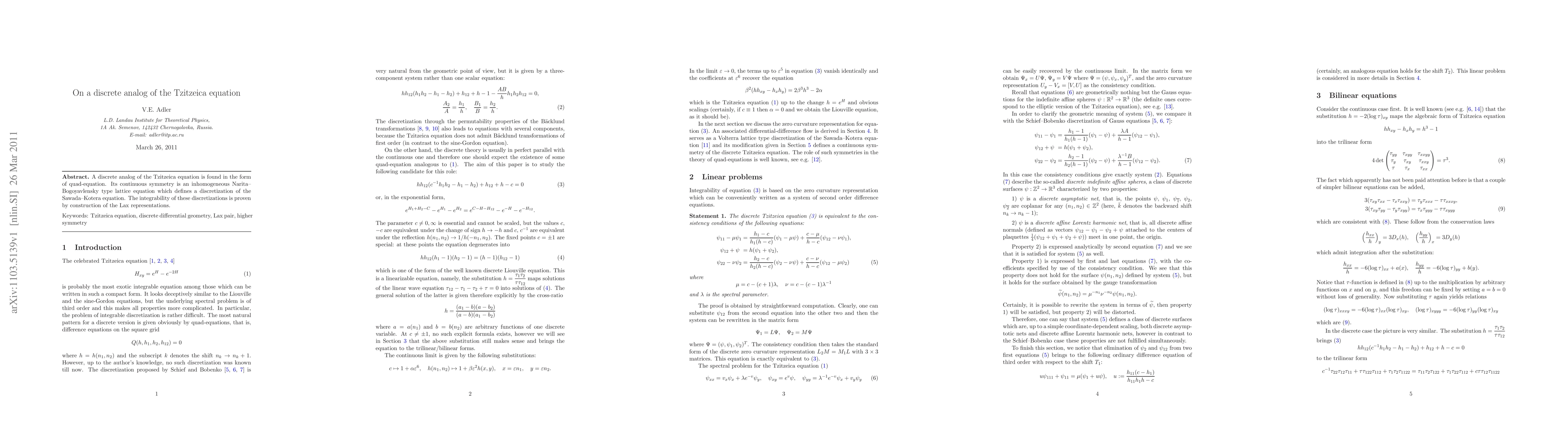 A discrete analog of the Tzitzeica equation is found in the form of quad-equation. Its continuous symmetry is an inhomogeneous Narita--Bogoyavlensky type lattice equation which defines a discretization of the Sawada--Kotera equation. The integrability of these discretizations is proven by construction of the Lax representations.