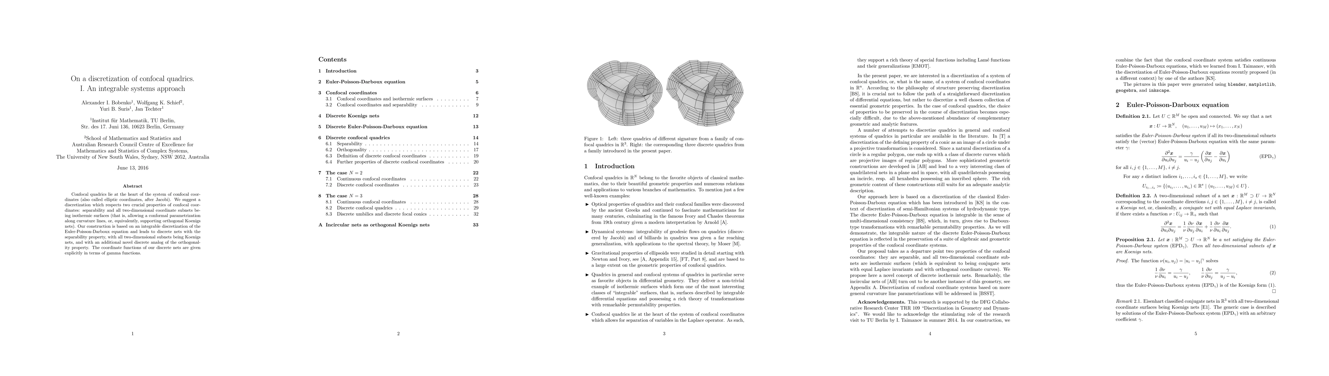 Confocal quadrics lie at the heart of the system of confocal coordinates (also called elliptic coordinates, after Jacobi). We suggest a discretization which respects two crucial properties of confocal coordinates: separability and all two-dimensional coordinate subnets being isothermic surfaces (that is, allowing a conformal parametrization along curvature lines, or, equivalently, supporting orthogonal Koenigs nets). Our construction is based on an integrable discretization of the Euler-Poisson-Darboux equation and leads to discrete nets with the separability property, with all two-dimensional subnets being Koenigs nets, and with an additional novel discrete analog of the orthogonality property. The coordinate functions of our discrete nets are given explicitly in terms of gamma functions.