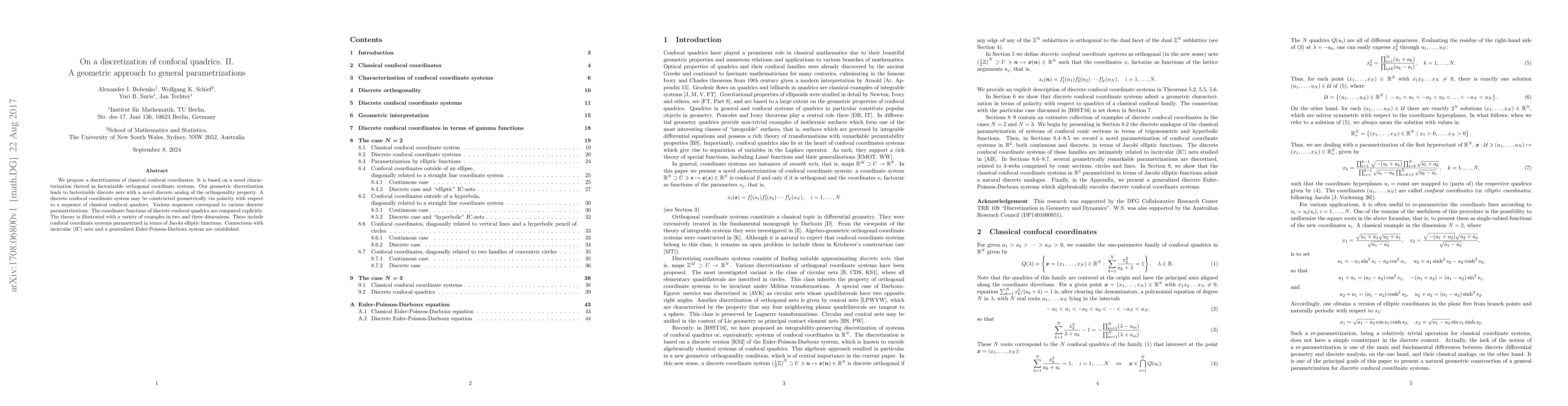 This paper introduces a novel geometric discretization method for confocal quadrics, characterizing them as factorizable orthogonal coordinate systems. It constructs discrete analogs via geometric polarity, illustrating the method with examples in two and three dimensions and establishing connections to incircular nets and a generalized Euler-Poisson-Darboux system.