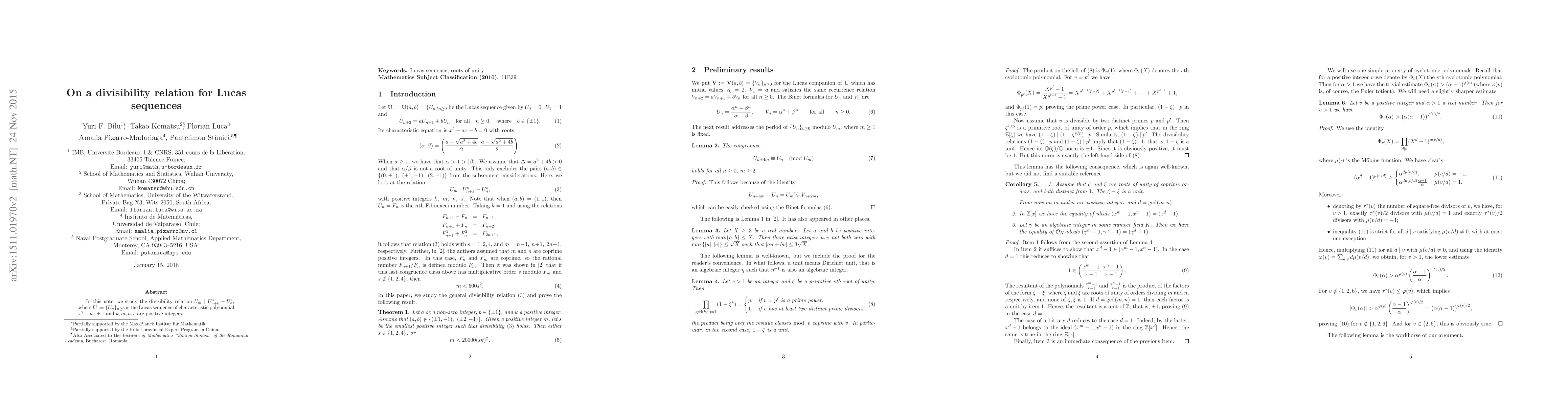 In this note, we study the divisibility relation $U_m\mid U_{n+k}^s-U_n^s$, where ${\bf U}:=\{U_n\}_{n\ge 0}$ is the Lucas sequence of characteristic polynomial $x^2-ax\pm 1$ and $k,m,n,s$ are positive integers.
