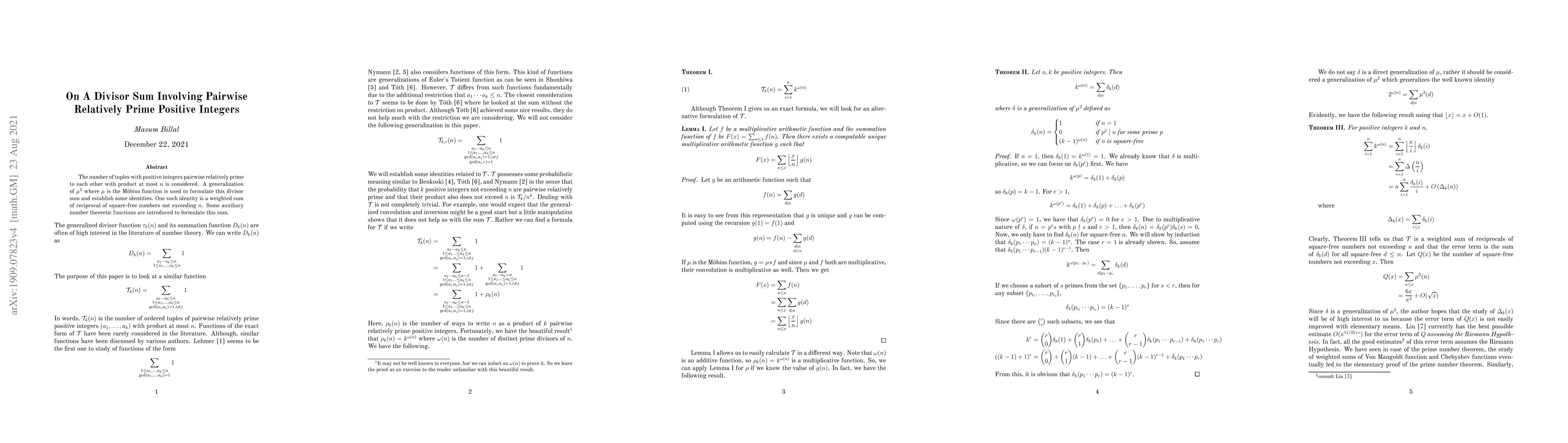 This paper explores the count of tuples of pairwise relatively prime positive integers whose product is at most $n$ and introduces a generalized Möbius function to derive a divisor sum identity, including a weighted sum of reciprocals of square-free numbers up to $n$. Auxiliary number theoretic functions are utilized to formulate this sum.