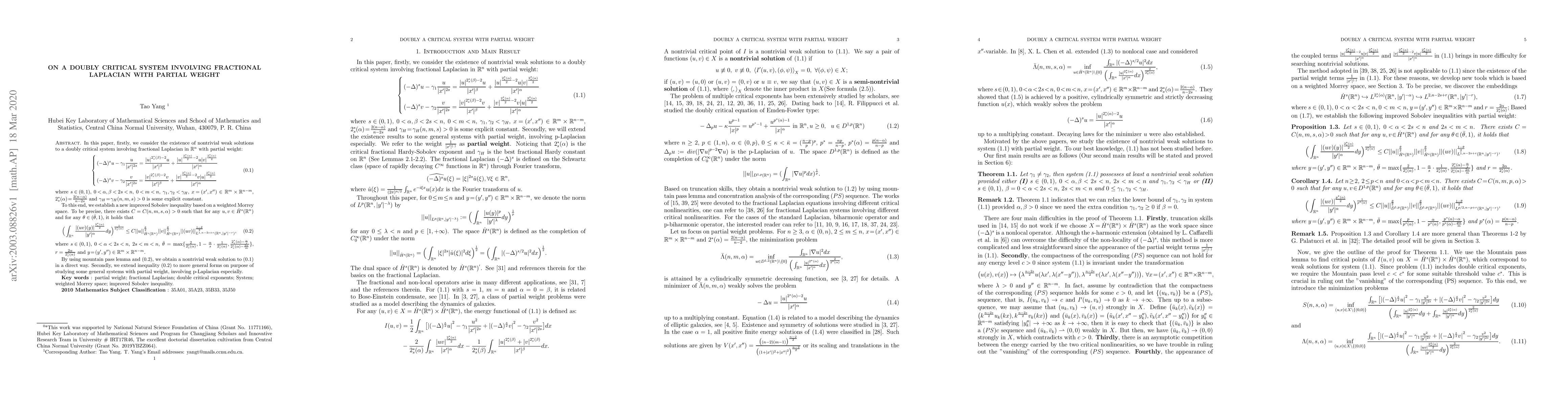 In this paper, we establish a new improved Sobolev inequality based on a weighted Morrey space. To be precise, there exists $C=C(n,m,s,\alpha)>0$ such that for any $u,v \in {\dot{H}}^s(\mathbb{R}^{n})$ and for any $\theta \in (\bar{\theta},1)$, it holds that \begin{equation} \label{eq0.3} \Big( \int_{ \mathbb{R}^{n} } \frac{ |(uv)(y)|^{\frac{2^*_{s}(\alpha)}{2} } } { |y'|^{\alpha} } dy \Big)^{ \frac{1}{ 2^*_{s} (\alpha) }} \leq C ||u||_{{\dot{H}}^s(\mathbb{R}^{n})}^{\frac{\theta}{2}} ||v||_{{\dot{H}}^s(\mathbb{R}^{n})}^{\frac{\theta}{2}} ||(uv)||^{\frac{1-\theta}{2}}_{ L^{1,n-2s+r}(\mathbb{R}^{n},|y'|^{-r}) }, \end{equation} where $s \!\in\! (0,1)$, $0\!<\!\alpha\!<\!2s\!<\!n$, $2s\!<\!m\!<\!n$, $\bar{\theta}=\max \{ \frac{2}{2^*_{s}(\alpha)}, 1-\frac{\alpha}{s}\cdot\frac{1}{2^*_{s}(\alpha)}, \frac{2^*_{s}(\alpha)-\frac{\alpha}{s}}{2^*_{s}(\alpha)-\frac{2\alpha}{m}} \}$, $r=\frac{2\alpha}{ 2^*_{s}(\alpha) }$ and $y\!=\!(y',y'') \in \mathbb{R}^{m} \times \mathbb{R}^{n-m}$. By using mountain pass lemma and (\ref{eq0.3}), we obtain a nontrivial weak solution to a doubly critical system involving fractional Laplacian in $\mathbb{R}^{n}$ with partial weight in a direct way. Furthermore, we extend inequality (\ref{eq0.3}) to more general forms on purpose of studying some general systems with partial weight, involving p-Laplacian especially.
