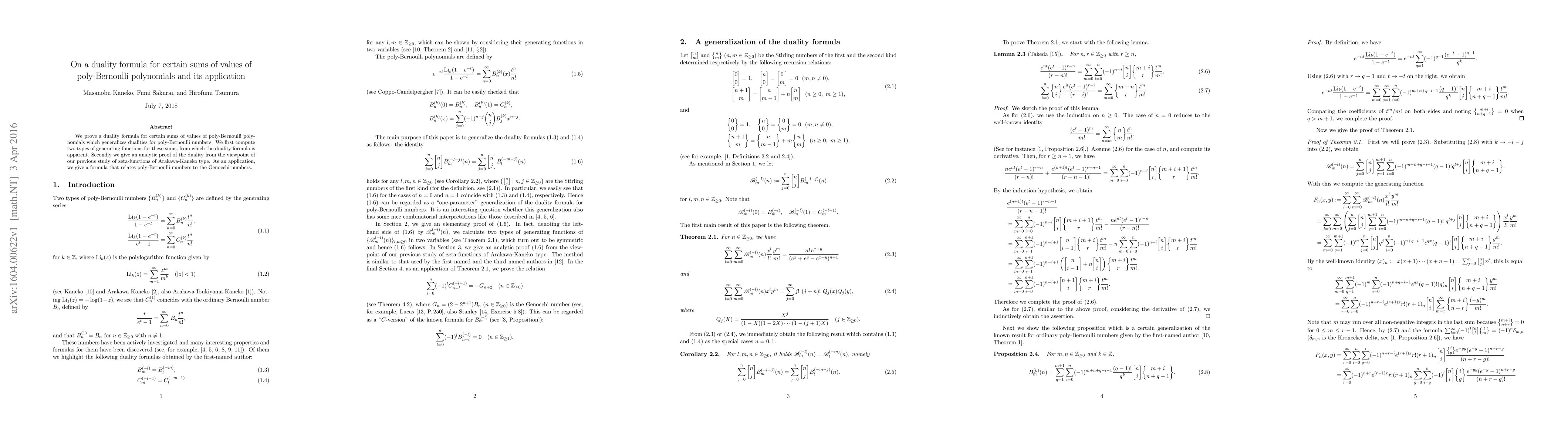 Researchers prove a duality formula for certain sums of poly-Bernoulli polynomial values, generalizing existing dualities and providing a new application linking poly-Bernoulli numbers to Genocchi numbers.