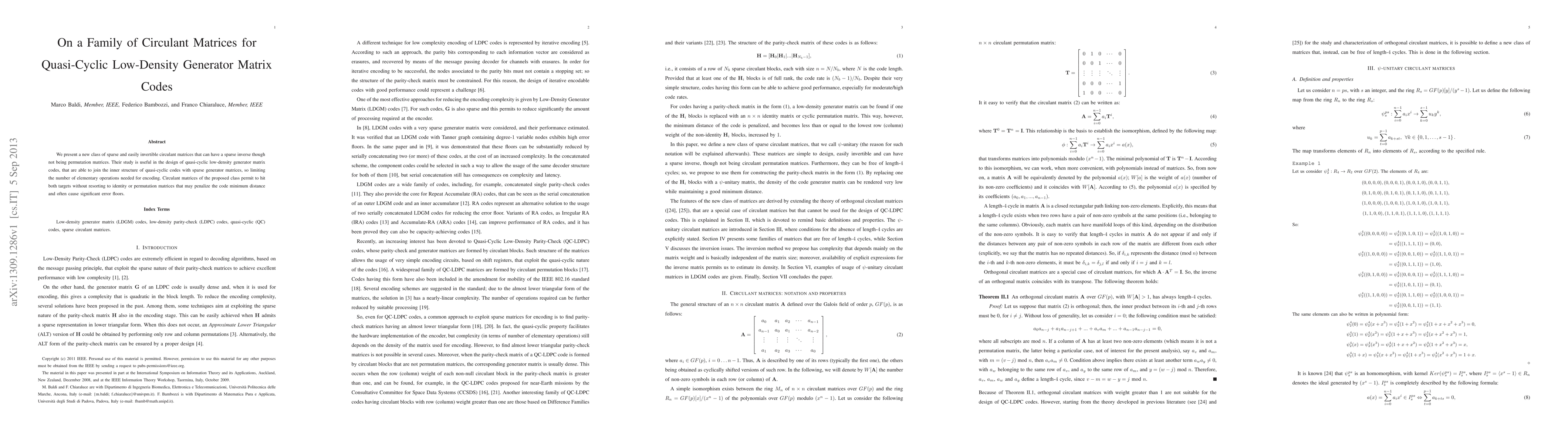We present a new class of sparse and easily invertible circulant matrices that can have a sparse inverse though not being permutation matrices. Their study is useful in the design of quasi-cyclic low-density generator matrix codes, that are able to join the inner structure of quasi-cyclic codes with sparse generator matrices, so limiting the number of elementary operations needed for encoding. Circulant matrices of the proposed class permit to hit both targets without resorting to identity or permutation matrices that may penalize the code minimum distance and often cause significant error floors.