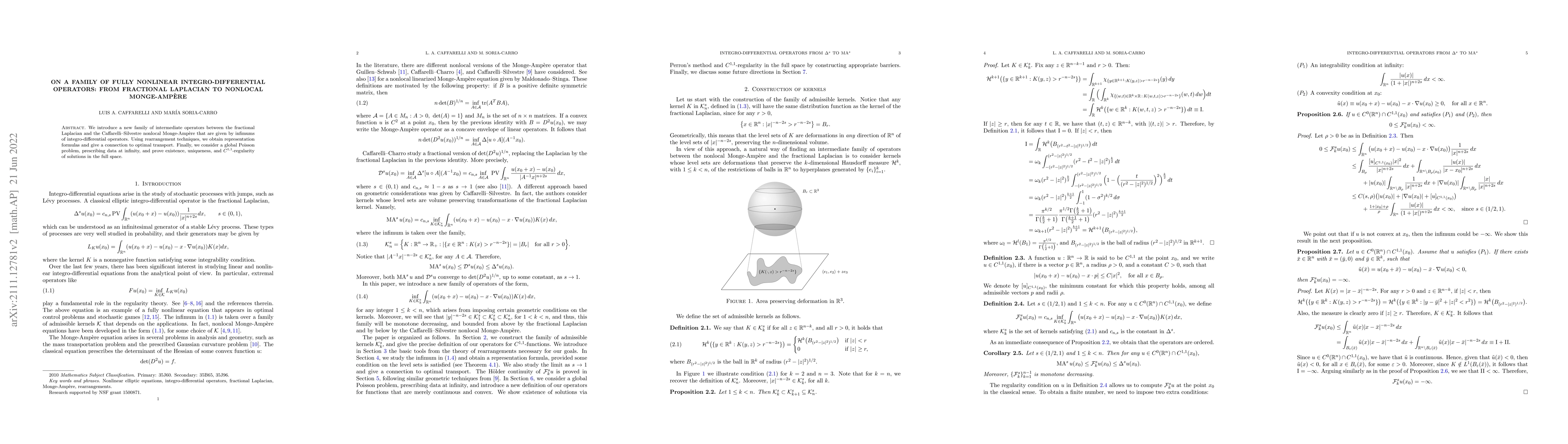 This paper introduces a new family of intermediate integro-differential operators between the fractional Laplacian and nonlocal Monge-Ampère, establishing representation formulas and connections to optimal transport. It also proves existence, uniqueness, and regularity of solutions to a global Poisson problem with data at infinity.