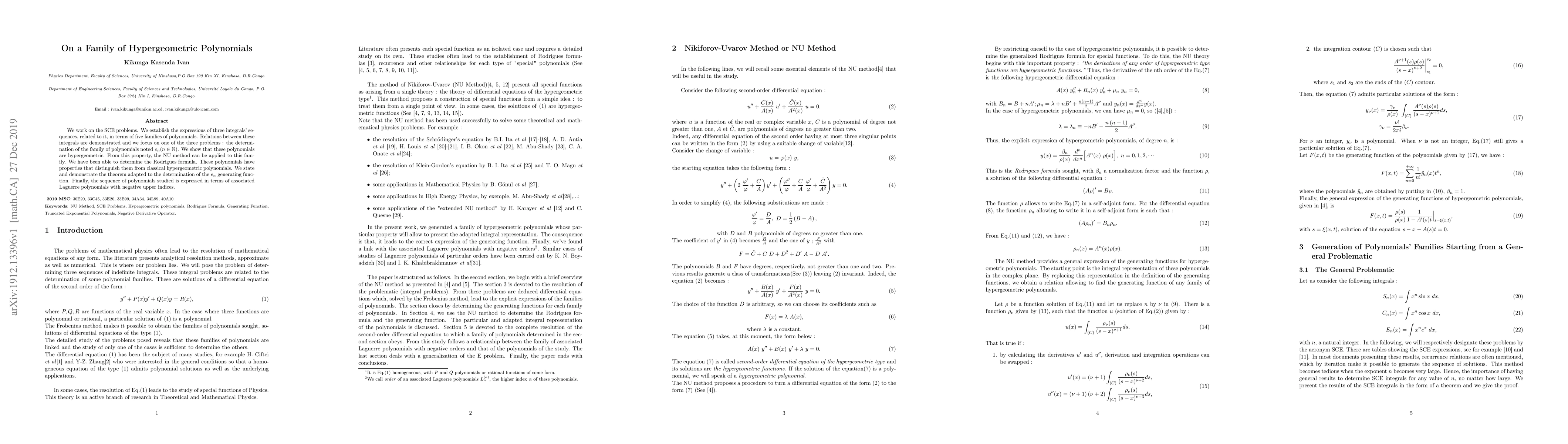 We work on the SCE problems. We establish the expressions of three integrals' sequences, related to it, in terms of five families of polynomials. Relations between these integrals are demonstrated and we focus on one of the three problems : the determination of the family of polynomials noted $e_n (n \in \mathbb{N})$. We show taht these polynomials are hypergeometric. From this property, the NU method can be applied to this family. We have been able to determine the Rodrigues formula. These polynomials have properties that distinguish them from classical hypergeometric polynomials. We state and demonstrate the theorem adapted to the determination of the generating function of $e_n$. Finally, the sequence of polynomials studied is expressed in terms of associated Laguerre polynomials with negative upper indices.
