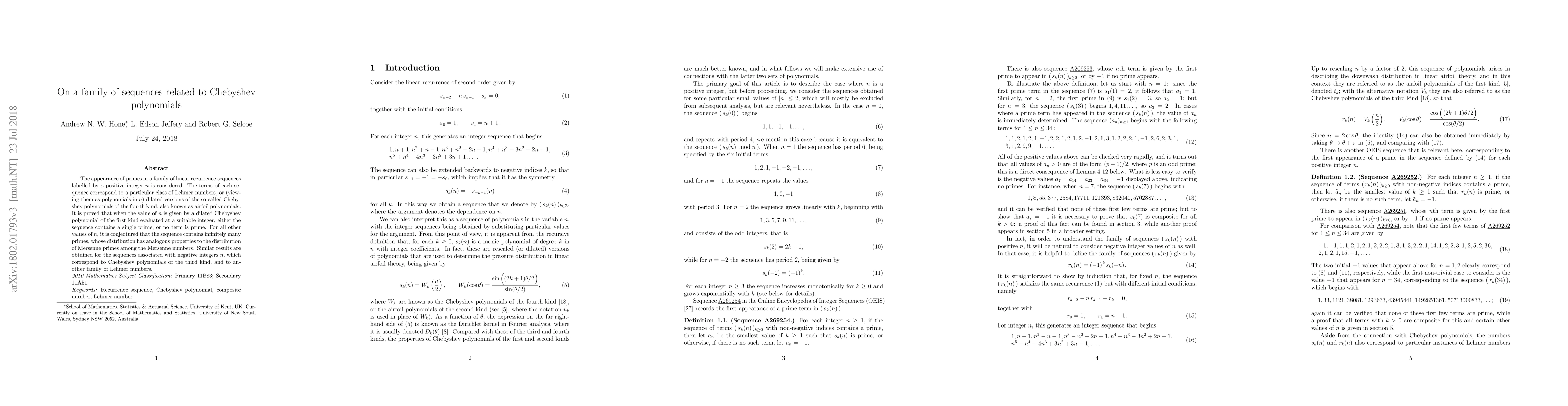 The appearance of primes in a family of linear recurrence sequences labelled by a positive integer $n$ is considered. The terms of each sequence correspond to a particular class of Lehmer numbers, or (viewing them as polynomials in $n$) dilated versions of the so-called Chebyshev polynomials of the fourth kind, also known as airfoil polynomials. It is proved that when the value of $n$ is given by a dilated Chebyshev polynomial of the first kind evaluated at a suitable integer, either the sequence contains a single prime, or no term is prime. For all other values of $n$, it is conjectured that the sequence contains infinitely many primes, whose distribution has analogous properties to the distribution of Mersenne primes among the Mersenne numbers. Similar results are obtained for the sequences associated with negative integers $n$, which correspond to Chebyshev polynomials of the third kind, and to another family of Lehmer numbers.
