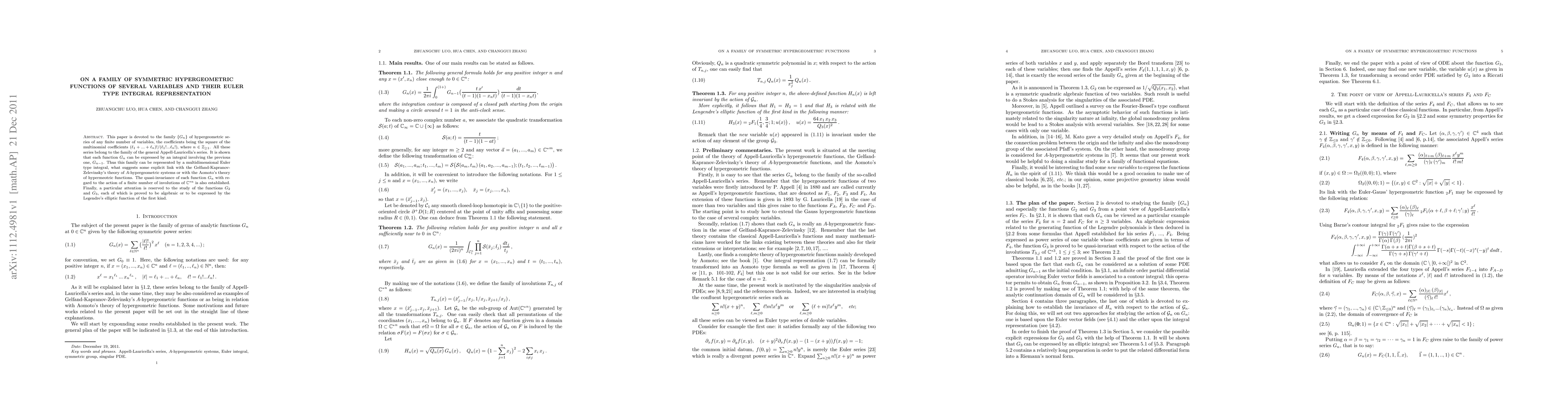This paper explores a family of symmetric hypergeometric functions of several variables, represented by the series $\{G_n\}$, whose coefficients are the squares of multinomial coefficients. The functions are shown to have an Euler type integral representation and exhibit quasi-invariance under certain involutions, with specific attention given to the algebraic nature of $G_2$ and $G_3$.