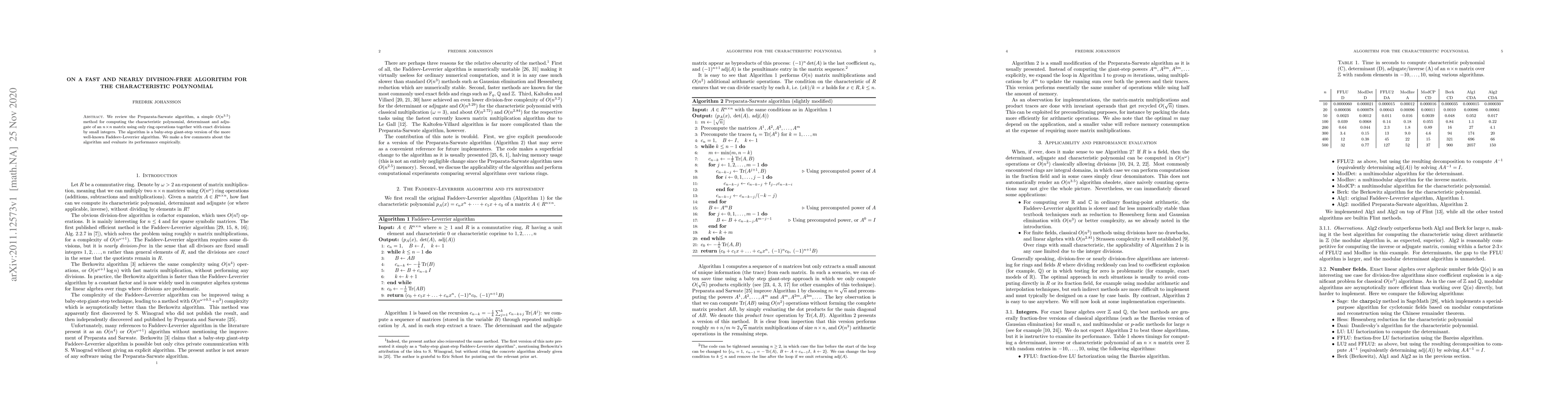 Researchers review a fast algorithm for computing characteristic polynomial of matrices with O(n^3.5) complexity, highlighting its simplicity and potential performance improvements over other methods.