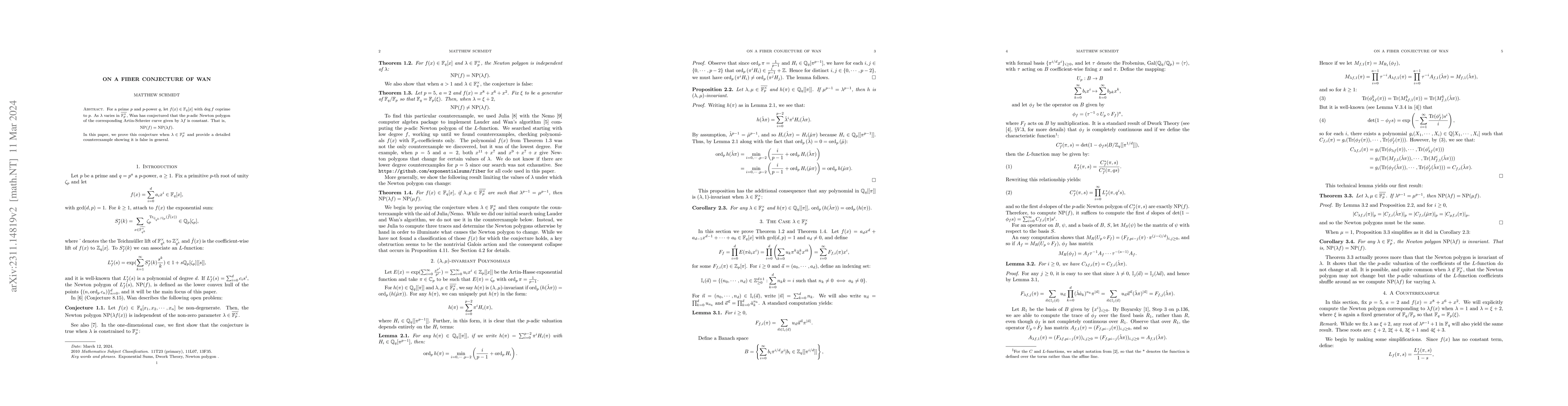 For a prime $p$ and $p$-power $q$, let $f(x)\in\mathbb{F}_q[x]$ with $\textrm{deg}\ f$ coprime to $p$. As $\lambda$ varies in $\overline{\mathbb{F}_p^\times}$, Wan has conjectured that the $p$-adic Newton polygon of the corresponding Artin-Schreier curve given by $\lambda f$ is constant. That is, \[ \textrm{NP}(f) = \textrm{NP}(\lambda f). \] In this paper, we prove this conjecture when $\lambda\in\mathbb{F}_p^\times$ and provide a detailed counterexample showing it is false in general.