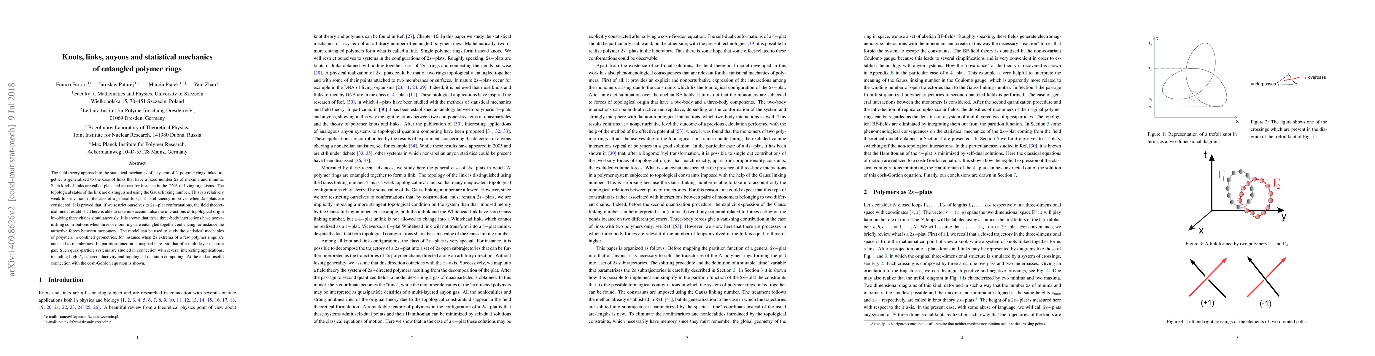 The field theory approach to the statistical mechanics of a system of N polymer rings linked together is generalized to the case of links that have a fixed number $2s$ of maxima and minima. Such kind of links are called plats and appear for instance in the DNA of living organisms. The topological states of the link are distinguished using the Gauss linking number. This is a relatively weak link invariant in the case of a general link, but its efficiency improves when $2s-$plats are considered. It is proved that, if we restrict ourselves to $2s-$plat conformations, the field theoretical model established here is able to take into account also the interactions of topological origin involving three chains simultaneously. It is shown that these three-body interactions have nonvanishing contributions when three or more rings are entangled together, enhancing for instance the attractive forces between monomers. The model can be used to study the statistical mechanics of polymers in confined geometries, for instance when $2s$ extrema of a few polymer rings are attached to membranes. Its partition function is mapped here into that of a multi-layer electron gas. Such quasi-particle systems are studied in connection with several interesting applications, including high-$T_c$ superconductivity and topological quantum computing. At the end an useful connection with the cosh-Gordon equation is shown.