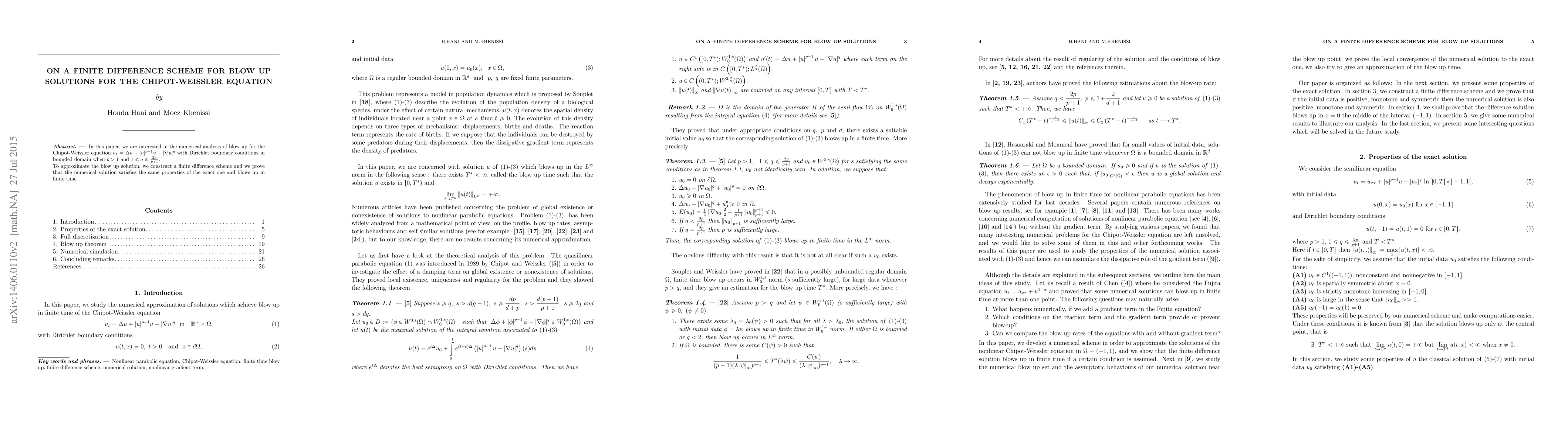In this paper, we are interested in the numerical analysis of blow up for the Chipot-Weissler equation with Dirichlet boundary conditions in bounded domain. To approximate the blow up solution, we construct a finite difference scheme and we prove that the numerical solution satisfies the same properties of the exact one and blows up in finite time.