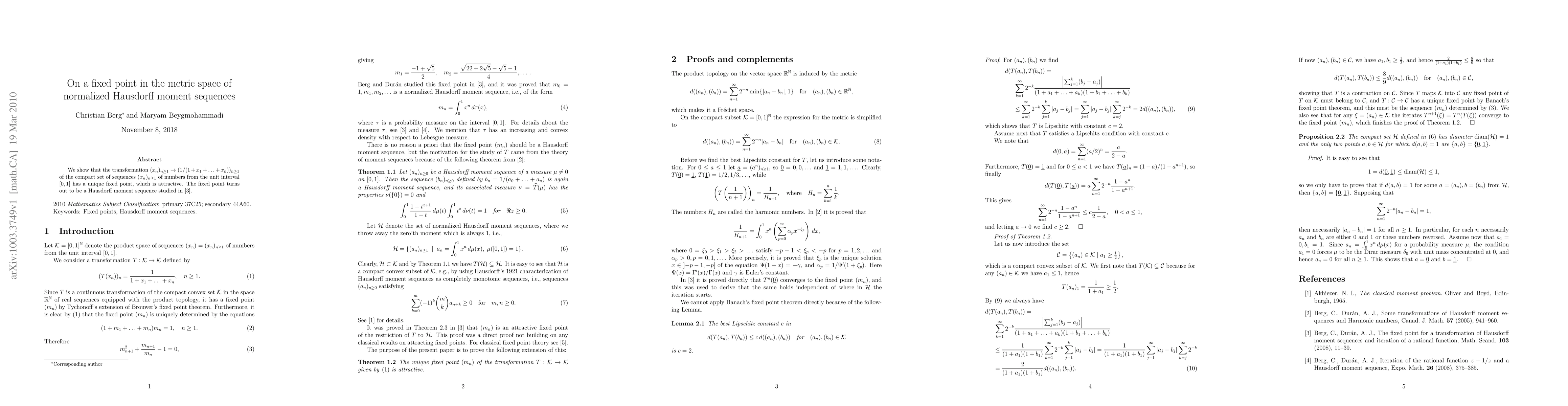We show that the transformation (x_n)_{n\ge 1}\to (1/(1+x_1+...+x_n))_{n\ge 1} of the compact set of sequences (x_n)_{n\ge 1} of numbers from the unit interval [0,1] has a unique fixed point, which is attractive. The fixed point turns out to be a Hausdorff moment sequence studied in papers by Berg and Dur\'an in 2008.