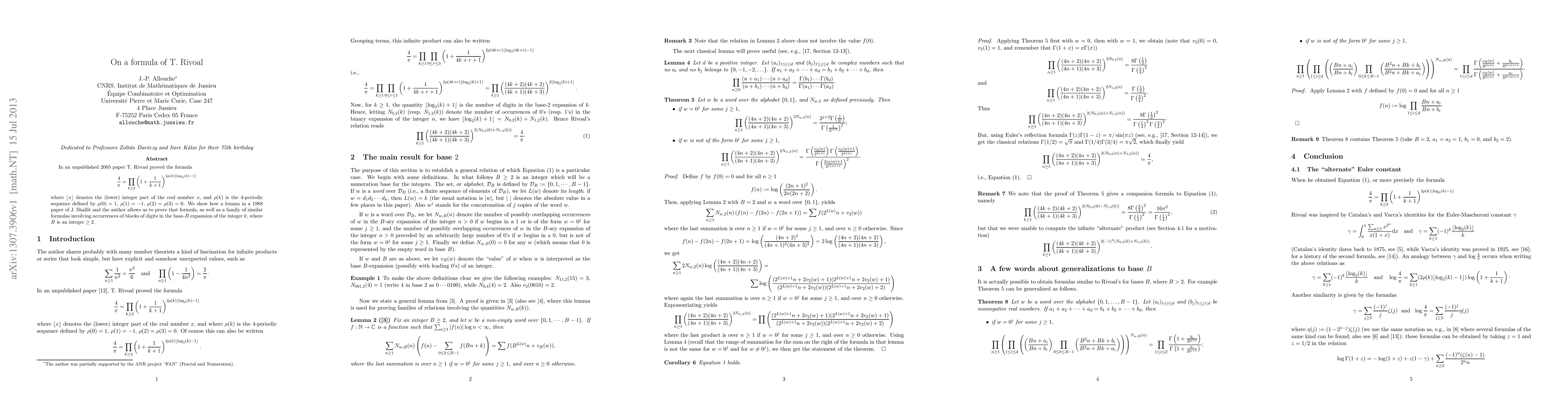 This paper presents a proof for a formula by T. Rivoal from 2005, which expresses 4/pi as an infinite product. The authors also demonstrate how a lemma from a 1988 paper by J. Shallit and the author can be used to prove this formula and a family of similar formulas. These formulas involve blocks of digits in the base-B expansion of the integer k, where B is any integer greater than 1.