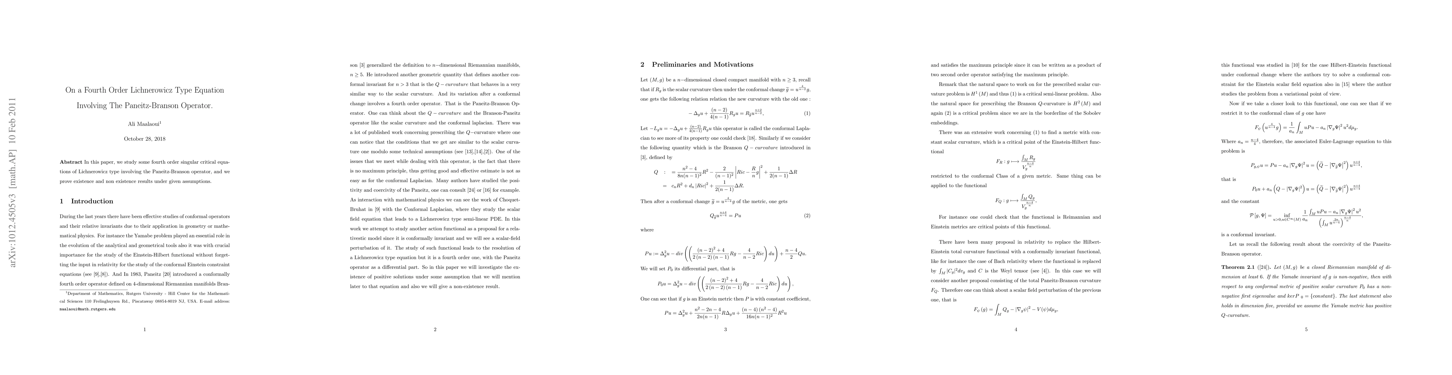 This research paper investigates specific fourth-order critical equations, akin to Lichnerowicz's type but involving the Paneitz-Branson operator. It presents proofs for existence and non-existence results under certain conditions.