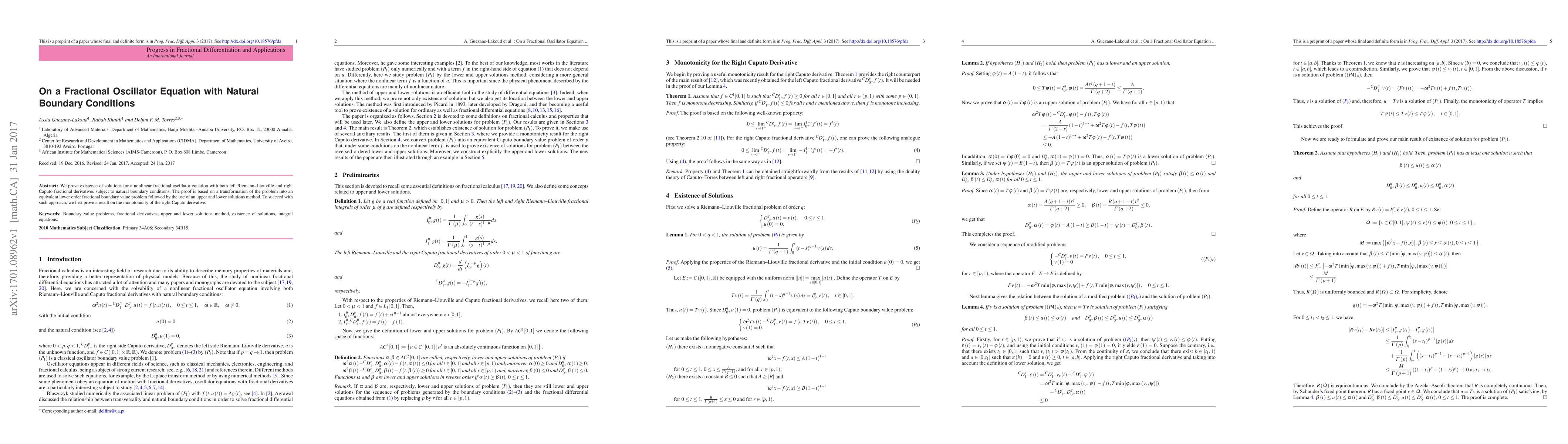 Summary: This paper establishes the existence of solutions for a nonlinear fractional oscillator equation incorporating both left Riemann-Liouville and right Caputo derivatives under natural boundary conditions. The proof leverages a transformation into a lower order problem and employs an upper and lower solutions method, supported by a monotonicity result for the right Caputo derivative.