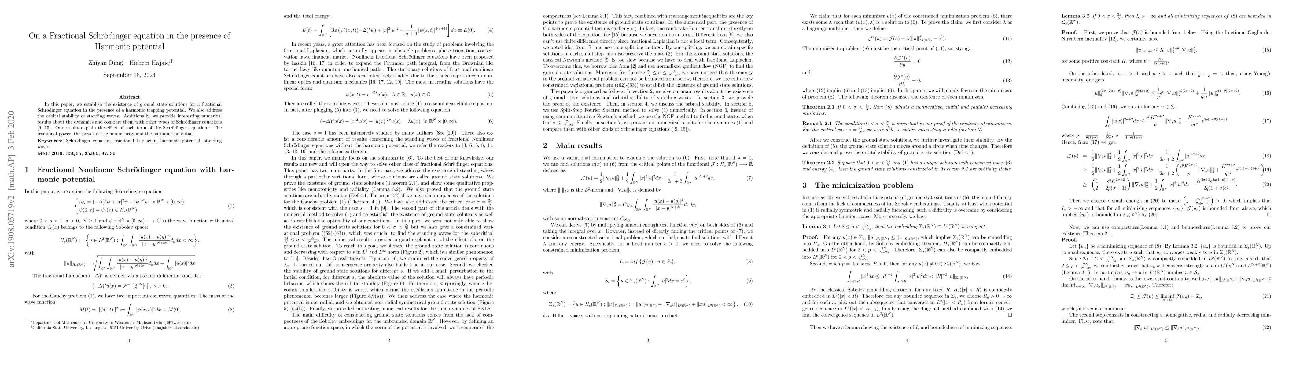 In this paper, we establish the existence of ground state solutions for a fractional Schr\"odinger equation in the presence of a harmonic trapping potential. We also address the orbital stability of standing waves. Additionally, we provide interesting numerical results about the dynamics and compare them with other types of Schr\"odinger equations. Our results explain the effect of each term of the Schr\"odinger equation : The fractional power, the power of the nonlinearity and the harmonic potential.