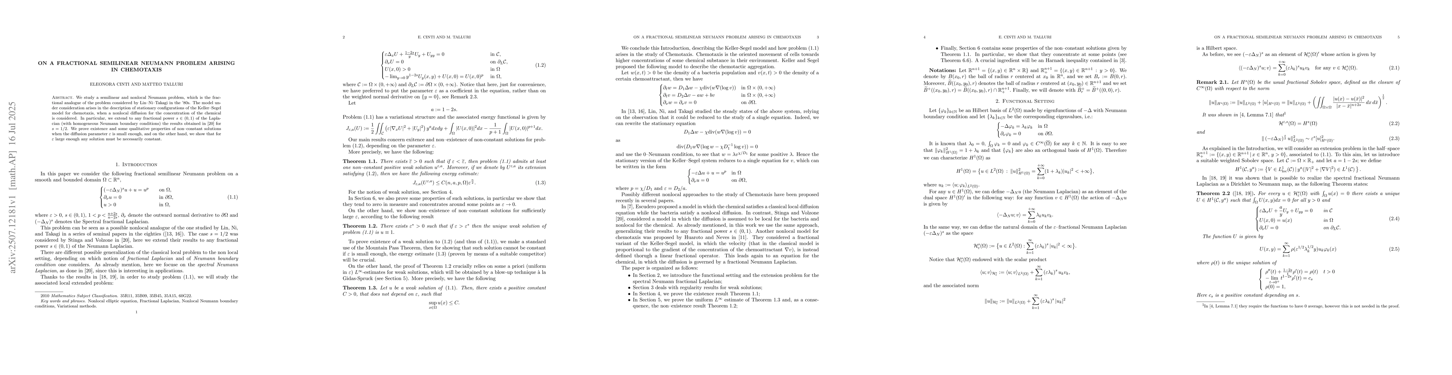 We study a semilinear and nonlocal Neumann problem, which is the fractional analogue of the problem considered by Lin--Ni--Takagi in the '80s. The model under consideration arises in the description of stationary configurations of the Keller--Segel model for chemotaxis, when a nonlocal diffusion for the concentration of the chemical is considered. In particular, we extend to any fractional power $s\in (0,1)$ of the Laplacian (with homogeneous Neumann boundary conditions) the results obtained in [20] for $s=1/2$. We prove existence and some qualitative properties of non--constant solutions when the diffusion parameter $\varepsilon$ is small enough, and on the other hand, we show that for $\varepsilon$ large enough any solution must be necessarily constant.