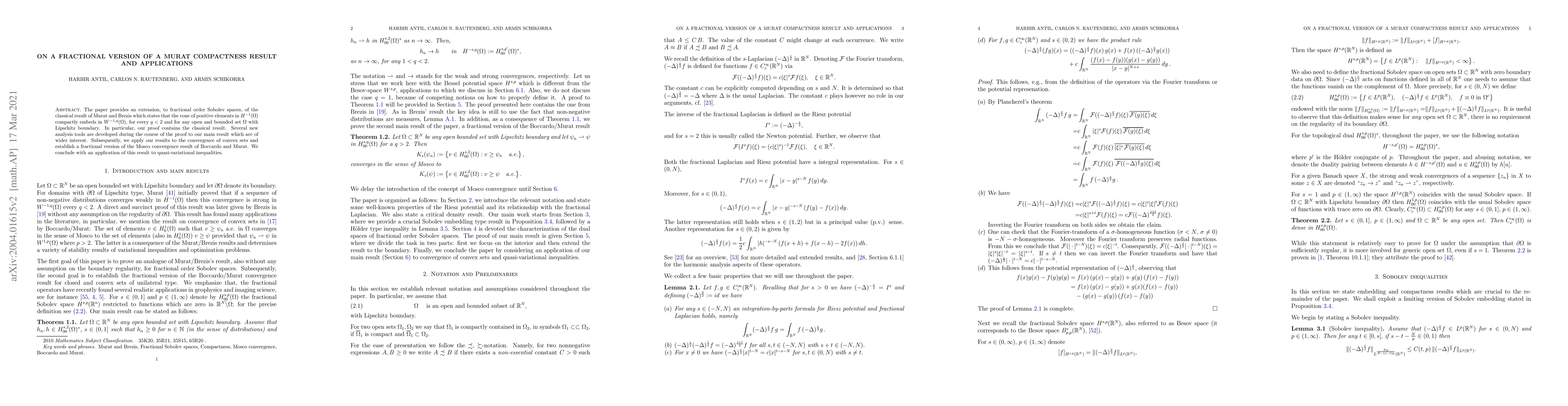 The paper provides an extension, to fractional order Sobolev spaces, of the classical result of Murat and Brezis which states that the positive cone of elements in $H^{-1}(\Omega)$ compactly embeds in $W^{-1,q}(\Omega)$, for every $q < 2$ and for any open and bounded set $\Omega$ with Lipschitz boundary. In particular, our proof contains the classical result. Several new analysis tools are developed during the course of the proof to our main result which are of wider interest. Subsequently, we apply our results to the convergence of convex sets and establish a fractional version of the Mosco convergence result of Boccardo and Murat. We conclude with an application of this result to quasi-variational inequalities.