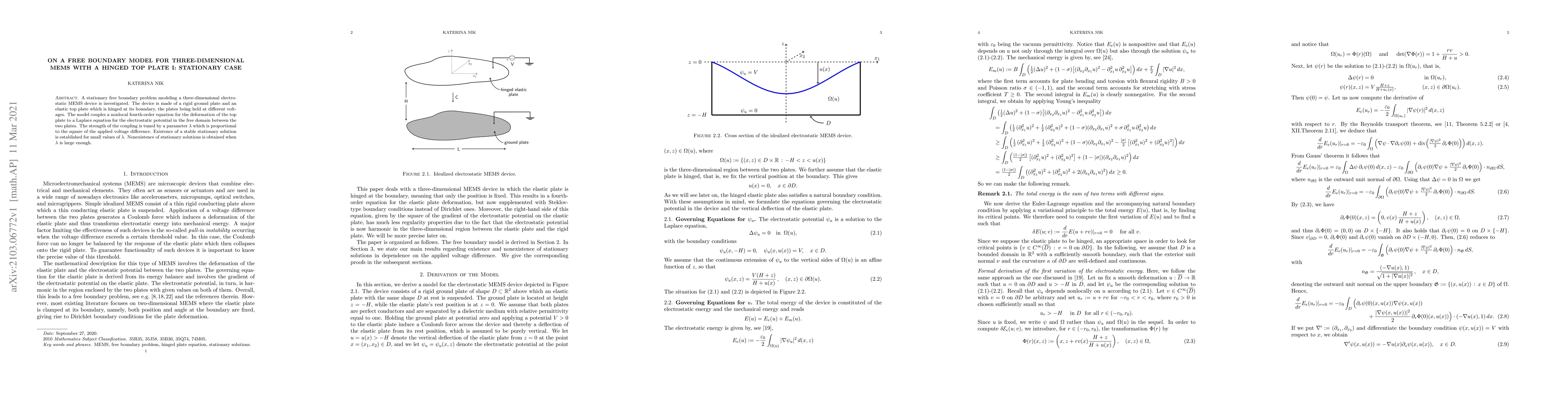 This paper investigates a stationary free boundary model for a three-dimensional MEMS device with a hinged elastic top plate, coupling a nonlocal fourth-order deformation equation to an electrostatic Laplace equation. It establishes the existence of stable solutions for small applied voltage differences and nonexistence for large differences.