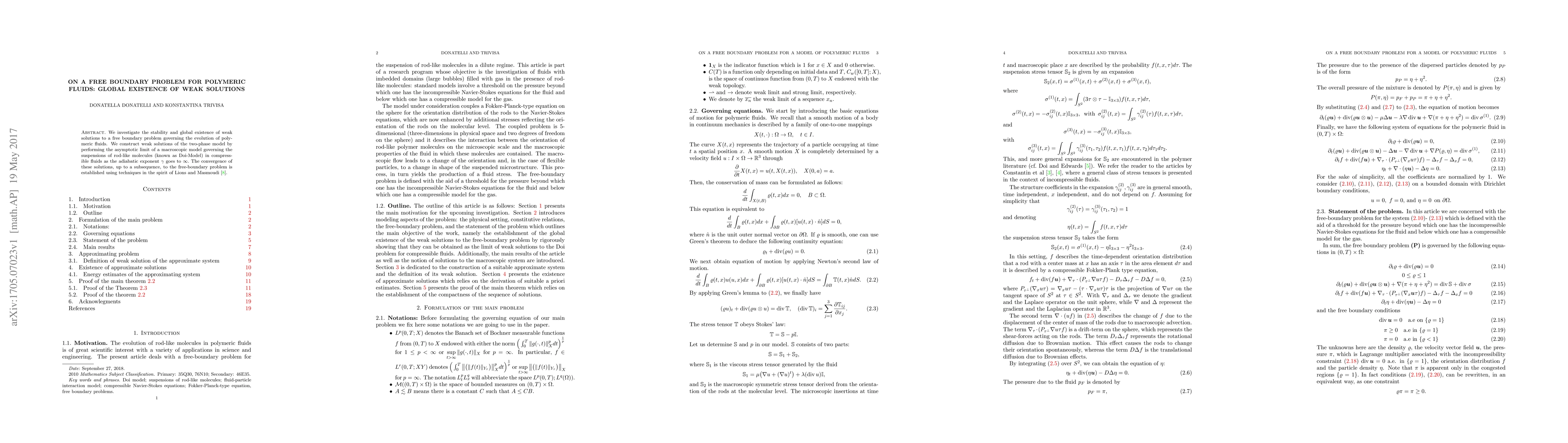 The research employs asymptotic limits of a macroscopic model governing suspensions of rod-like molecules in compressible fluids (Doi-Model) as the adiabatic exponent γ goes to infinity to construct weak solutions for a free boundary problem of polymeric fluids.