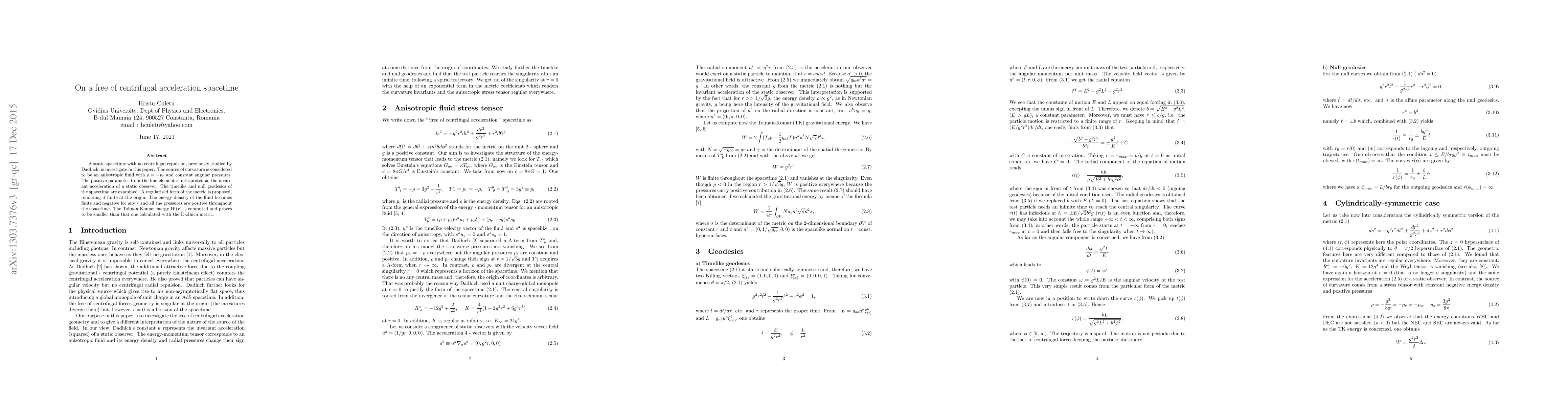 A static spacetime with no centrifugal repulsion, previously studied by Dadhich, is investigate in this paper. The source of curvature is considered to be an anisotropic fluid with $\rho = -p_{r}$ and constant angular pressures. The positive parameter from the line-element is interpreted as the invariant acceleration of a static observer. The timelike and null geodesics of the spacetime are examined. A regularized form of the metric is proposed, rendering it finite at the origin. The energy density of the fluid becomes finite and negative for any $r$ and all the pressures are positive throughout the spacetime. The Tolman-Komar energy $W(r)$ is computed and proves to be smaller than that one calculated with the Dadhich metric.