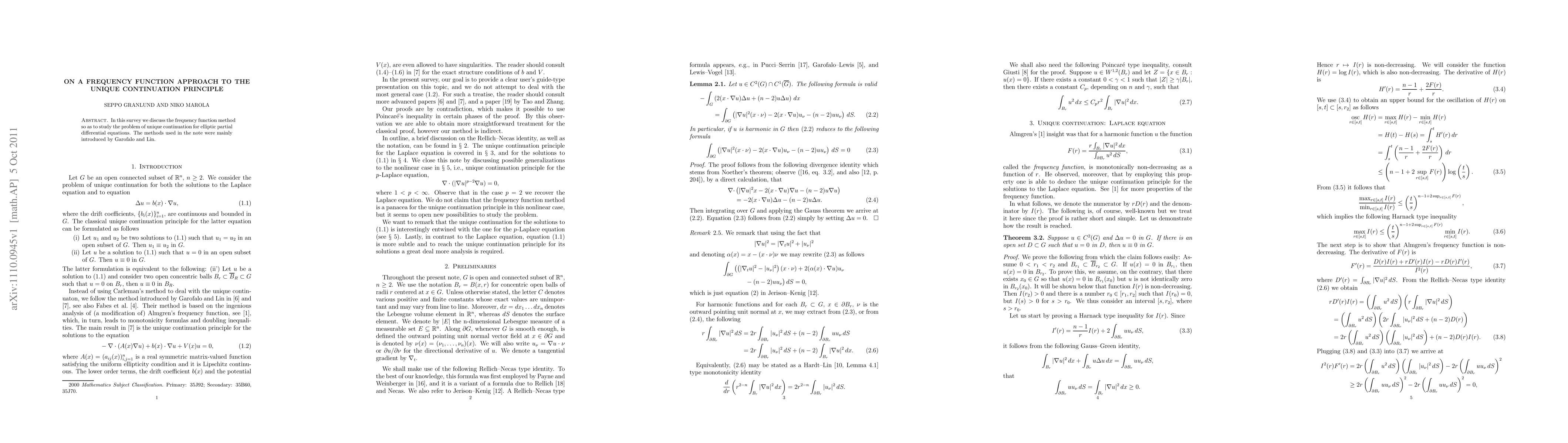 In this survey we discuss the frequency function method so as to study the problem of unique continuation for elliptic partial differential equations. The methods used in the note were mainly introduced by Garofalo and Lin.