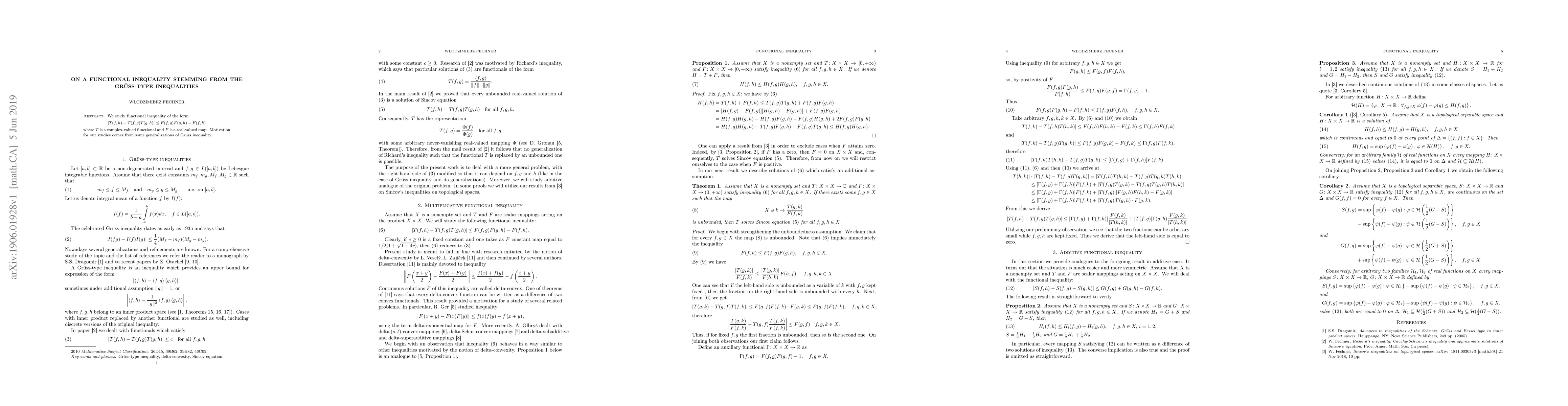 This paper investigates a functional inequality involving complex-valued functionals and real-valued maps, motivated by generalizations of Gr\"uss inequalities. The focus is on understanding the inequality's structure and implications.