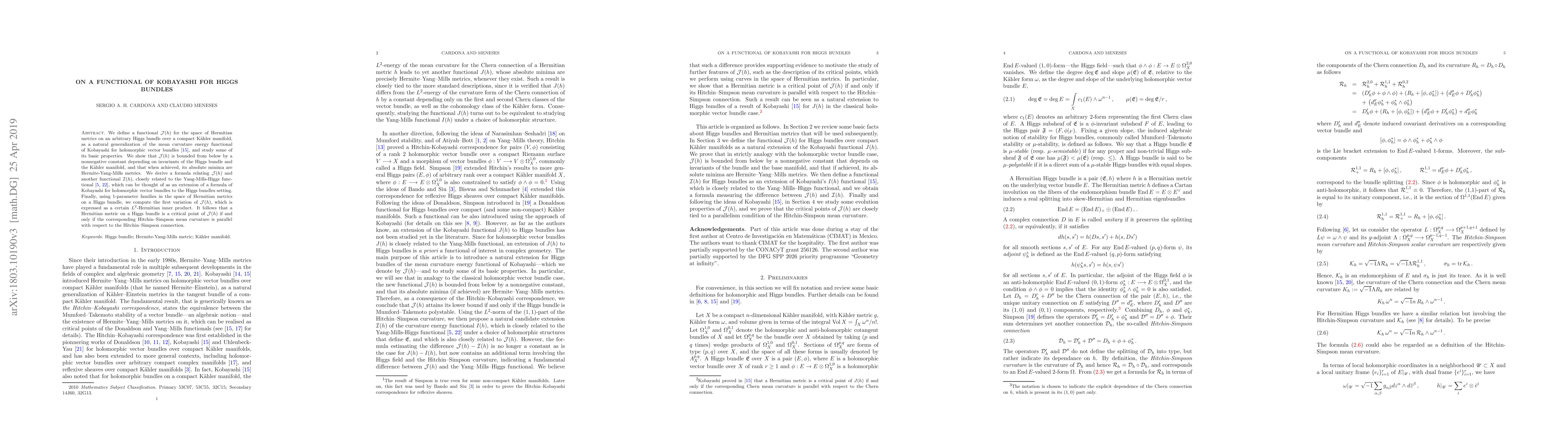 This paper introduces a functional for Higgs bundles that generalizes Kobayashi's mean curvature energy functional to Hermitian metrics on Higgs bundles, showing it is bounded from below and has absolute minima that correspond to Hermite-Yang-Mills metrics.